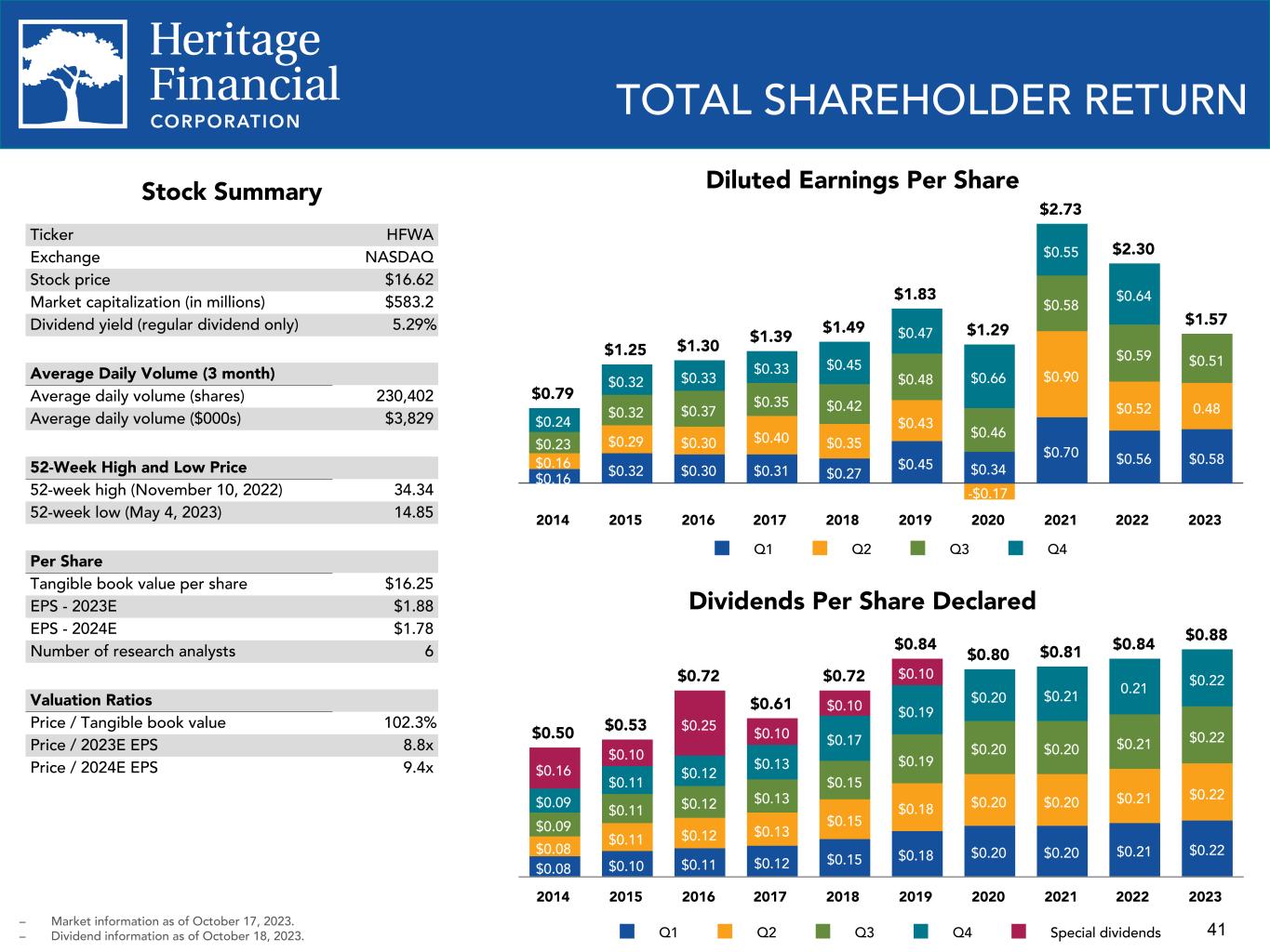 41 TOTAL SHAREHOLDER RETURN Stock Summary Ticker HFWA Exchange NASDAQ Stock price $16.62 Market capitalization (in millions) $583.2 Dividend yield (regular dividend only) 5.29% Average Daily Volume (3 month) Average daily volume (shares) 230,402 Average daily volume ($000s) $3,829 52-Week High and Low Price 52-week high (November 10, 2022) 34.34 52-week low (May 4, 2023) 14.85 Per Share Tangible book value per share $16.25 EPS - 2023E $1.88 EPS - 2024E $1.78 Number of research analysts 6 Valuation Ratios Price / Tangible book value 102.3% Price / 2023E EPS 8.8x Price / 2024E EPS 9.4x Dividends Per Share Declared $0.88 $0.50 $0.53 $0.72 $0.61 $0.72 $0.84 $0.80 $0.81 $0.84 $0.08 $0.10 $0.11 $0.12 $0.15 $0.18 $0.20 $0.20 $0.21 $0.22$0.08 $0.11 $0.12 $0.13 $0.15 $0.18 $0.20 $0.20 $0.21 $0.22 $0.09 $0.11 $0.12 $0.13 $0.15 $0.19 $0.20 $0.20 $0.21 $0.22 $0.09 $0.11 $0.12 $0.13 $0.17 $0.19 $0.20 $0.21 0.21 $0.22 $0.16 $0.10 $0.25 $0.10 $0.10 $0.10 Q1 Q2 Q3 Q4 Special dividends 2014 2015 2016 2017 2018 2019 2020 2021 2022 2023 Diluted Earnings Per Share – Market information as of October 17, 2023. – Dividend information as of October 18, 2023. $1.57 $0.79 $1.25 $1.30 $1.39 $1.49 $1.83 $1.29 $2.73 $2.30 $0.16 $0.32 $0.30 $0.31 $0.27 $0.45 $0.34 $0.70 $0.56 $0.58$0.16 $0.29 $0.30 $0.40 $0.35 $0.43 -$0.17 $0.90 $0.52 0.48 $0.23 $0.32 $0.37 $0.35 $0.42 $0.48 $0.46 $0.58 $0.59 $0.51 $0.24 $0.32 $0.33 $0.33 $0.45 $0.47 $0.66 $0.55 $0.64 Q1 Q2 Q3 Q4 2014 2015 2016 2017 2018 2019 2020 2021 2022 2023