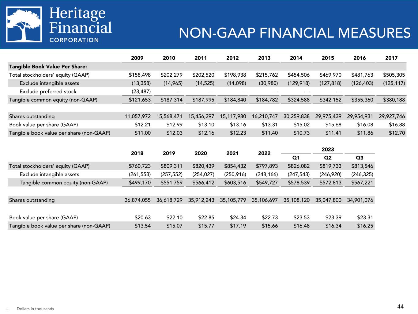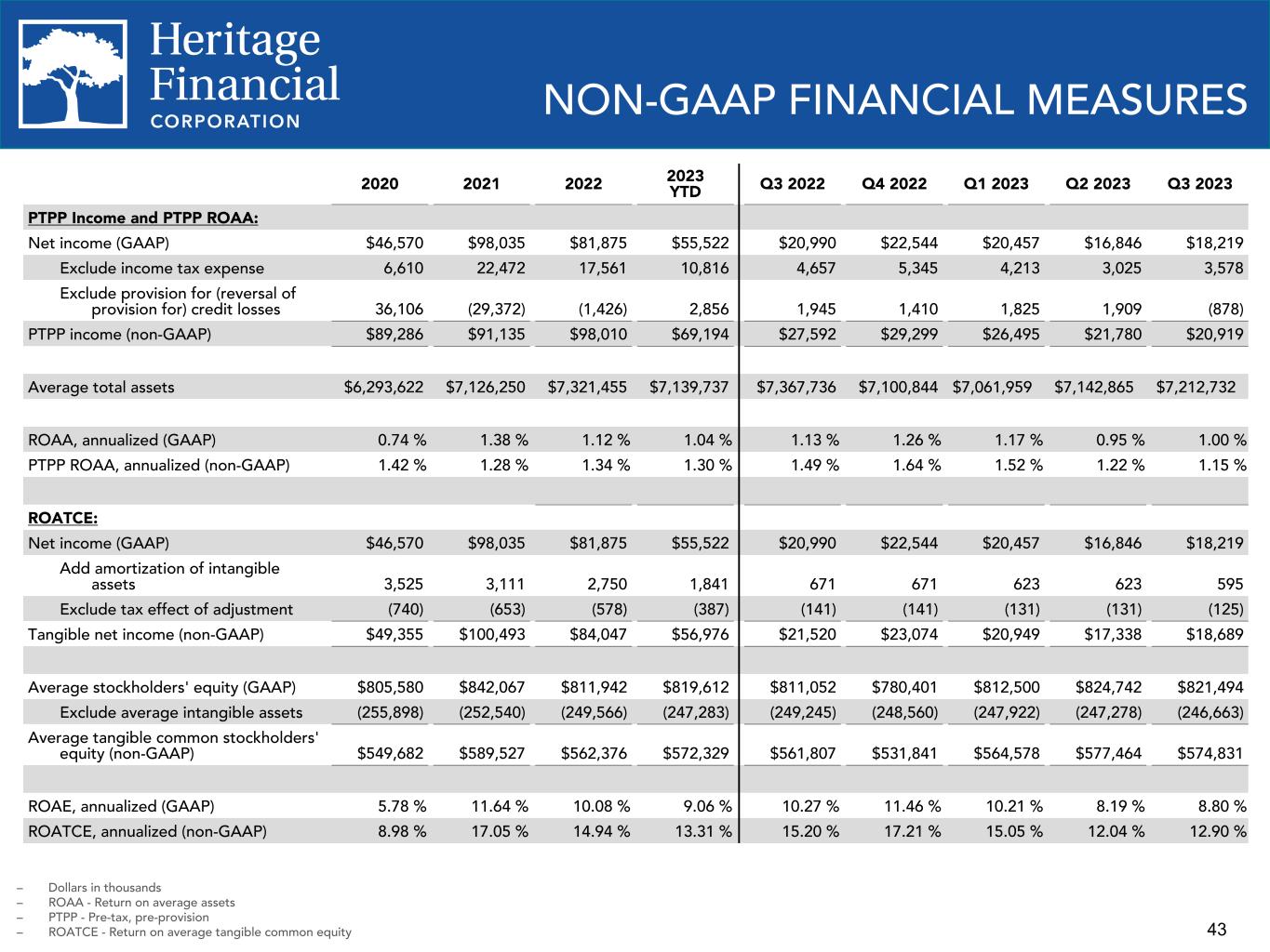 43 NON-GAAP FINANCIAL MEASURES 2020 2021 2022 2023 YTD Q3 2022 Q4 2022 Q1 2023 Q2 2023 Q3 2023 PTPP Income and PTPP ROAA: Net income (GAAP) $46,570 $98,035 $81,875 $55,522 $20,990 $22,544 $20,457 $16,846 $18,219 Exclude income tax expense 6,610 22,472 17,561 10,816 4,657 5,345 4,213 3,025 3,578 Exclude provision for (reversal of provision for) credit losses 36,106 (29,372) (1,426) 2,856 1,945 1,410 1,825 1,909 (878) PTPP income (non-GAAP) $89,286 $91,135 $98,010 $69,194 $27,592 $29,299 $26,495 $21,780 $20,919 Average total assets $6,293,622 $7,126,250 $7,321,455 $7,139,737 $7,367,736 $7,100,844 $7,061,959 $7,142,865 $7,212,732 ROAA, annualized (GAAP) 0.74 % 1.38 % 1.12 % 1.04 % 1.13 % 1.26 % 1.17 % 0.95 % 1.00 % PTPP ROAA, annualized (non-GAAP) 1.42 % 1.28 % 1.34 % 1.30 % 1.49 % 1.64 % 1.52 % 1.22 % 1.15 % ROATCE: Net income (GAAP) $46,570 $98,035 $81,875 $55,522 $20,990 $22,544 $20,457 $16,846 $18,219 Add amortization of intangible assets 3,525 3,111 2,750 1,841 671 671 623 623 595 Exclude tax effect of adjustment (740) (653) (578) (387) (141) (141) (131) (131) (125) Tangible net income (non-GAAP) $49,355 $100,493 $84,047 $56,976 $21,520 $23,074 $20,949 $17,338 $18,689 Average stockholders' equity (GAAP) $805,580 $842,067 $811,942 $819,612 $811,052 $780,401 $812,500 $824,742 $821,494 Exclude average intangible assets (255,898) (252,540) (249,566) (247,283) (249,245) (248,560) (247,922) (247,278) (246,663) Average tangible common stockholders' equity (non-GAAP) $549,682 $589,527 $562,376 $572,329 $561,807 $531,841 $564,578 $577,464 $574,831 ROAE, annualized (GAAP) 5.78 % 11.64 % 10.08 % 9.06 % 10.27 % 11.46 % 10.21 % 8.19 % 8.80 % ROATCE, annualized (non-GAAP) 8.98 % 17.05 % 14.94 % 13.31 % 15.20 % 17.21 % 15.05 % 12.04 % 12.90 % – Dollars in thousands – ROAA - Return on average assets – PTPP - Pre-tax, pre-provision – ROATCE - Return on average tangible common equity