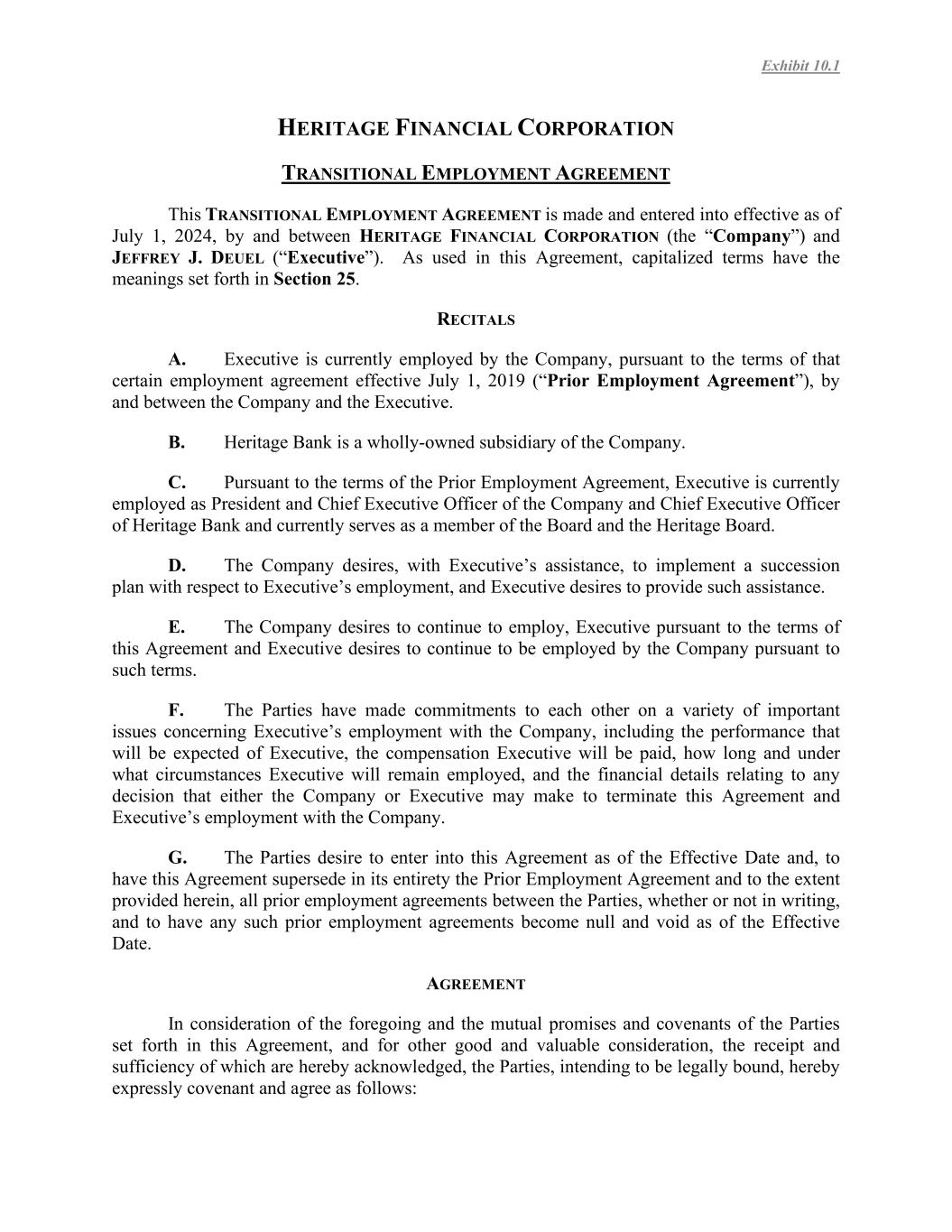 Exhibit 10.1 HERITAGE FINANCIAL CORPORATION TRANSITIONAL EMPLOYMENT AGREEMENT This TRANSITIONAL EMPLOYMENT AGREEMENT is made and entered into effective as of July 1, 2024, by and between HERITAGE FINANCIAL CORPORATION (the “Company”) and JEFFREY J. DEUEL (“Executive”). As used in this Agreement, capitalized terms have the meanings set forth in Section 25. RECITALS A. Executive is currently employed by the Company, pursuant to the terms of that certain employment agreement effective July 1, 2019 (“Prior Employment Agreement”), by and between the Company and the Executive. B. Heritage Bank is a wholly-owned subsidiary of the Company. C. Pursuant to the terms of the Prior Employment Agreement, Executive is currently employed as President and Chief Executive Officer of the Company and Chief Executive Officer of Heritage Bank and currently serves as a member of the Board and the Heritage Board. D. The Company desires, with Executive’s assistance, to implement a succession plan with respect to Executive’s employment, and Executive desires to provide such assistance. E. The Company desires to continue to employ, Executive pursuant to the terms of this Agreement and Executive desires to continue to be employed by the Company pursuant to such terms. F. The Parties have made commitments to each other on a variety of important issues concerning Executive’s employment with the Company, including the performance that will be expected of Executive, the compensation Executive will be paid, how long and under what circumstances Executive will remain employed, and the financial details relating to any decision that either the Company or Executive may make to terminate this Agreement and Executive’s employment with the Company. G. The Parties desire to enter into this Agreement as of the Effective Date and, to have this Agreement supersede in its entirety the Prior Employment Agreement and to the extent provided herein, all prior employment agreements between the Parties, whether or not in writing, and to have any such prior employment agreements become null and void as of the Effective Date. AGREEMENT In consideration of the foregoing and the mutual promises and covenants of the Parties set forth in this Agreement, and for other good and valuable consideration, the receipt and sufficiency of which are hereby acknowledged, the Parties, intending to be legally bound, hereby expressly covenant and agree as follows: