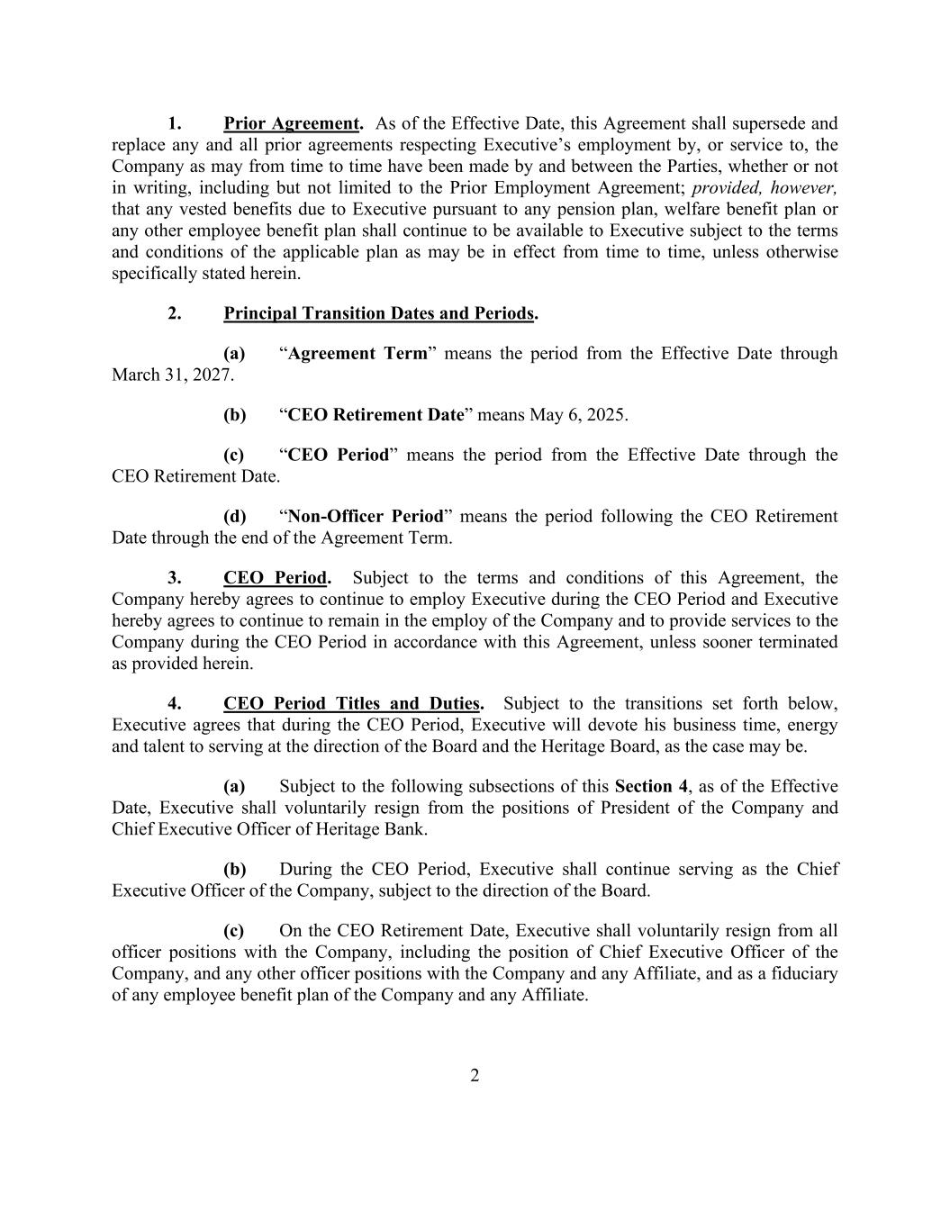 2 1. Prior Agreement. As of the Effective Date, this Agreement shall supersede and replace any and all prior agreements respecting Executive’s employment by, or service to, the Company as may from time to time have been made by and between the Parties, whether or not in writing, including but not limited to the Prior Employment Agreement; provided, however, that any vested benefits due to Executive pursuant to any pension plan, welfare benefit plan or any other employee benefit plan shall continue to be available to Executive subject to the terms and conditions of the applicable plan as may be in effect from time to time, unless otherwise specifically stated herein. 2. Principal Transition Dates and Periods. (a) “Agreement Term” means the period from the Effective Date through March 31, 2027. (b) “CEO Retirement Date” means May 6, 2025. (c) “CEO Period” means the period from the Effective Date through the CEO Retirement Date. (d) “Non-Officer Period” means the period following the CEO Retirement Date through the end of the Agreement Term. 3. CEO Period. Subject to the terms and conditions of this Agreement, the Company hereby agrees to continue to employ Executive during the CEO Period and Executive hereby agrees to continue to remain in the employ of the Company and to provide services to the Company during the CEO Period in accordance with this Agreement, unless sooner terminated as provided herein. 4. CEO Period Titles and Duties. Subject to the transitions set forth below, Executive agrees that during the CEO Period, Executive will devote his business time, energy and talent to serving at the direction of the Board and the Heritage Board, as the case may be. (a) Subject to the following subsections of this Section 4, as of the Effective Date, Executive shall voluntarily resign from the positions of President of the Company and Chief Executive Officer of Heritage Bank. (b) During the CEO Period, Executive shall continue serving as the Chief Executive Officer of the Company, subject to the direction of the Board. (c) On the CEO Retirement Date, Executive shall voluntarily resign from all officer positions with the Company, including the position of Chief Executive Officer of the Company, and any other officer positions with the Company and any Affiliate, and as a fiduciary of any employee benefit plan of the Company and any Affiliate.