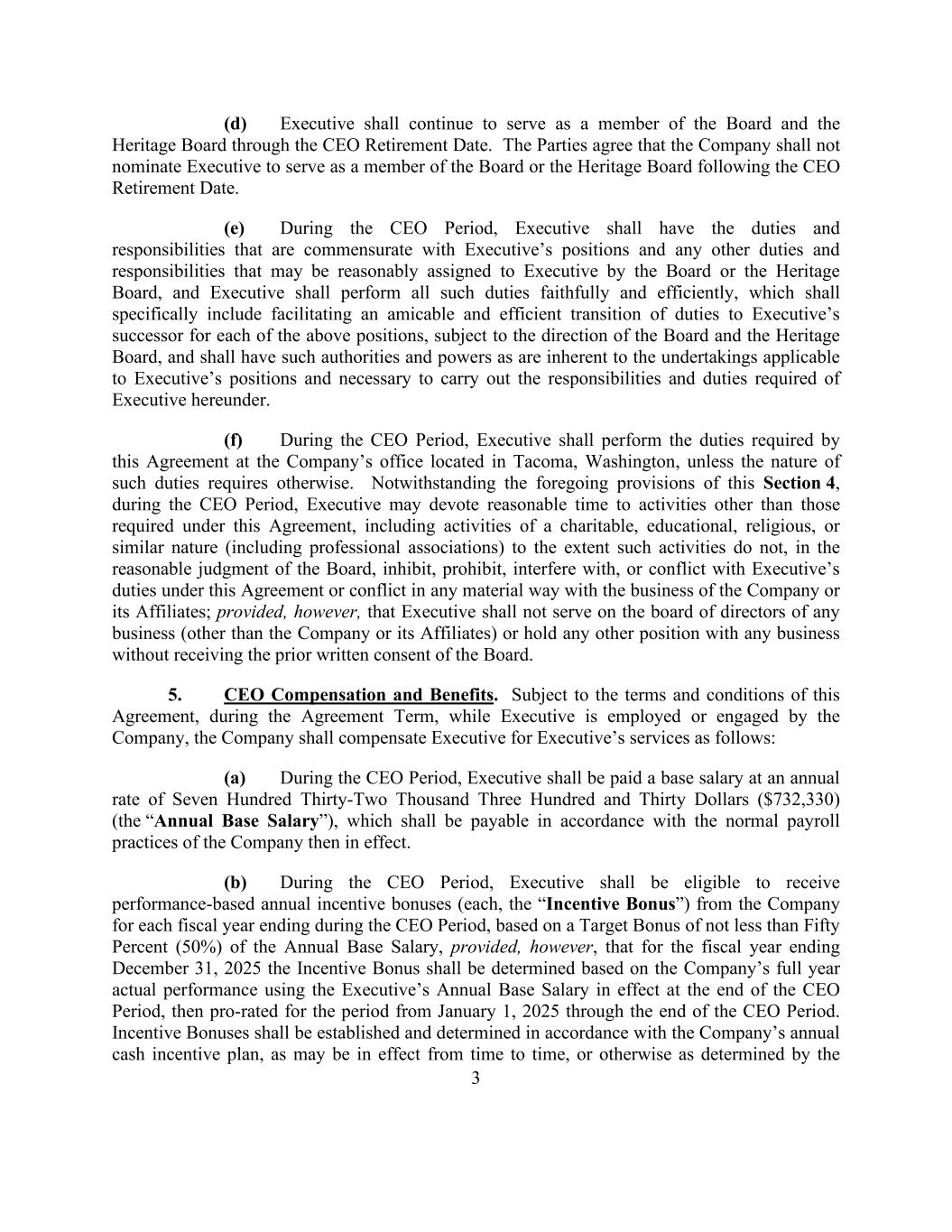 3 (d) Executive shall continue to serve as a member of the Board and the Heritage Board through the CEO Retirement Date. The Parties agree that the Company shall not nominate Executive to serve as a member of the Board or the Heritage Board following the CEO Retirement Date. (e) During the CEO Period, Executive shall have the duties and responsibilities that are commensurate with Executive’s positions and any other duties and responsibilities that may be reasonably assigned to Executive by the Board or the Heritage Board, and Executive shall perform all such duties faithfully and efficiently, which shall specifically include facilitating an amicable and efficient transition of duties to Executive’s successor for each of the above positions, subject to the direction of the Board and the Heritage Board, and shall have such authorities and powers as are inherent to the undertakings applicable to Executive’s positions and necessary to carry out the responsibilities and duties required of Executive hereunder. (f) During the CEO Period, Executive shall perform the duties required by this Agreement at the Company’s office located in Tacoma, Washington, unless the nature of such duties requires otherwise. Notwithstanding the foregoing provisions of this Section 4, during the CEO Period, Executive may devote reasonable time to activities other than those required under this Agreement, including activities of a charitable, educational, religious, or similar nature (including professional associations) to the extent such activities do not, in the reasonable judgment of the Board, inhibit, prohibit, interfere with, or conflict with Executive’s duties under this Agreement or conflict in any material way with the business of the Company or its Affiliates; provided, however, that Executive shall not serve on the board of directors of any business (other than the Company or its Affiliates) or hold any other position with any business without receiving the prior written consent of the Board. 5. CEO Compensation and Benefits. Subject to the terms and conditions of this Agreement, during the Agreement Term, while Executive is employed or engaged by the Company, the Company shall compensate Executive for Executive’s services as follows: (a) During the CEO Period, Executive shall be paid a base salary at an annual rate of Seven Hundred Thirty-Two Thousand Three Hundred and Thirty Dollars ($732,330) (the “Annual Base Salary”), which shall be payable in accordance with the normal payroll practices of the Company then in effect. (b) During the CEO Period, Executive shall be eligible to receive performance-based annual incentive bonuses (each, the “Incentive Bonus”) from the Company for each fiscal year ending during the CEO Period, based on a Target Bonus of not less than Fifty Percent (50%) of the Annual Base Salary, provided, however, that for the fiscal year ending December 31, 2025 the Incentive Bonus shall be determined based on the Company’s full year actual performance using the Executive’s Annual Base Salary in effect at the end of the CEO Period, then pro-rated for the period from January 1, 2025 through the end of the CEO Period. Incentive Bonuses shall be established and determined in accordance with the Company’s annual cash incentive plan, as may be in effect from time to time, or otherwise as determined by the