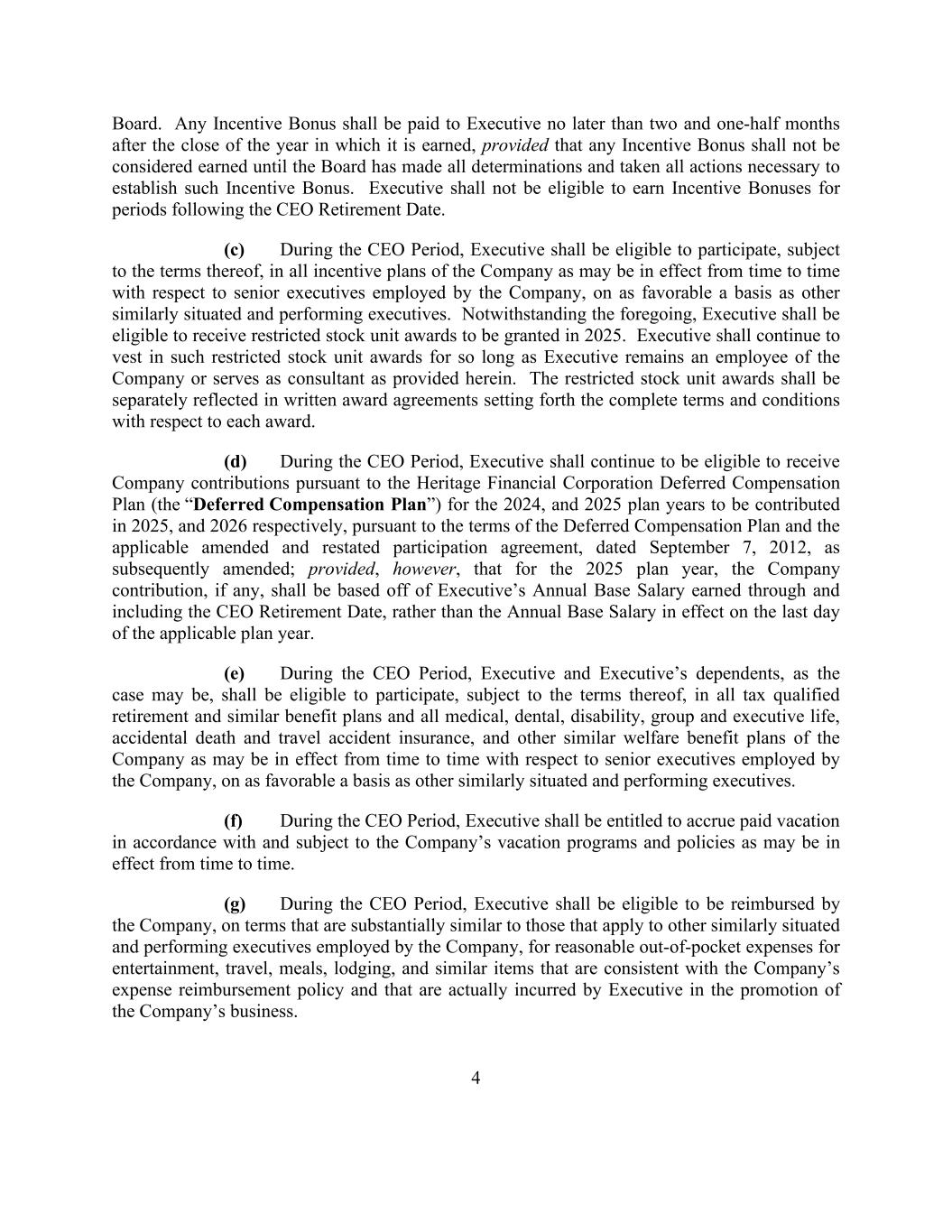 4 Board. Any Incentive Bonus shall be paid to Executive no later than two and one-half months after the close of the year in which it is earned, provided that any Incentive Bonus shall not be considered earned until the Board has made all determinations and taken all actions necessary to establish such Incentive Bonus. Executive shall not be eligible to earn Incentive Bonuses for periods following the CEO Retirement Date. (c) During the CEO Period, Executive shall be eligible to participate, subject to the terms thereof, in all incentive plans of the Company as may be in effect from time to time with respect to senior executives employed by the Company, on as favorable a basis as other similarly situated and performing executives. Notwithstanding the foregoing, Executive shall be eligible to receive restricted stock unit awards to be granted in 2025. Executive shall continue to vest in such restricted stock unit awards for so long as Executive remains an employee of the Company or serves as consultant as provided herein. The restricted stock unit awards shall be separately reflected in written award agreements setting forth the complete terms and conditions with respect to each award. (d) During the CEO Period, Executive shall continue to be eligible to receive Company contributions pursuant to the Heritage Financial Corporation Deferred Compensation Plan (the “Deferred Compensation Plan”) for the 2024, and 2025 plan years to be contributed in 2025, and 2026 respectively, pursuant to the terms of the Deferred Compensation Plan and the applicable amended and restated participation agreement, dated September 7, 2012, as subsequently amended; provided, however, that for the 2025 plan year, the Company contribution, if any, shall be based off of Executive’s Annual Base Salary earned through and including the CEO Retirement Date, rather than the Annual Base Salary in effect on the last day of the applicable plan year. (e) During the CEO Period, Executive and Executive’s dependents, as the case may be, shall be eligible to participate, subject to the terms thereof, in all tax qualified retirement and similar benefit plans and all medical, dental, disability, group and executive life, accidental death and travel accident insurance, and other similar welfare benefit plans of the Company as may be in effect from time to time with respect to senior executives employed by the Company, on as favorable a basis as other similarly situated and performing executives. (f) During the CEO Period, Executive shall be entitled to accrue paid vacation in accordance with and subject to the Company’s vacation programs and policies as may be in effect from time to time. (g) During the CEO Period, Executive shall be eligible to be reimbursed by the Company, on terms that are substantially similar to those that apply to other similarly situated and performing executives employed by the Company, for reasonable out-of-pocket expenses for entertainment, travel, meals, lodging, and similar items that are consistent with the Company’s expense reimbursement policy and that are actually incurred by Executive in the promotion of the Company’s business.