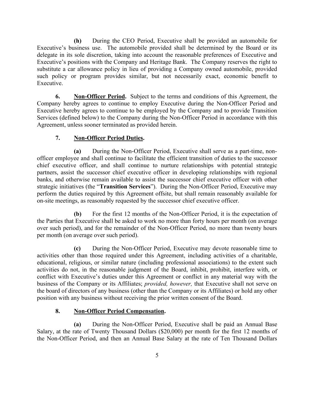 5 (h) During the CEO Period, Executive shall be provided an automobile for Executive’s business use. The automobile provided shall be determined by the Board or its delegate in its sole discretion, taking into account the reasonable preferences of Executive and Executive’s positions with the Company and Heritage Bank. The Company reserves the right to substitute a car allowance policy in lieu of providing a Company owned automobile, provided such policy or program provides similar, but not necessarily exact, economic benefit to Executive. 6. Non-Officer Period. Subject to the terms and conditions of this Agreement, the Company hereby agrees to continue to employ Executive during the Non-Officer Period and Executive hereby agrees to continue to be employed by the Company and to provide Transition Services (defined below) to the Company during the Non-Officer Period in accordance with this Agreement, unless sooner terminated as provided herein. 7. Non-Officer Period Duties. (a) During the Non-Officer Period, Executive shall serve as a part-time, non- officer employee and shall continue to facilitate the efficient transition of duties to the successor chief executive officer, and shall continue to nurture relationships with potential strategic partners, assist the successor chief executive officer in developing relationships with regional banks, and otherwise remain available to assist the successor chief executive officer with other strategic initiatives (the “Transition Services”). During the Non-Officer Period, Executive may perform the duties required by this Agreement offsite, but shall remain reasonably available for on-site meetings, as reasonably requested by the successor chief executive officer. (b) For the first 12 months of the Non-Officer Period, it is the expectation of the Parties that Executive shall be asked to work no more than forty hours per month (on average over such period), and for the remainder of the Non-Officer Period, no more than twenty hours per month (on average over such period). (c) During the Non-Officer Period, Executive may devote reasonable time to activities other than those required under this Agreement, including activities of a charitable, educational, religious, or similar nature (including professional associations) to the extent such activities do not, in the reasonable judgment of the Board, inhibit, prohibit, interfere with, or conflict with Executive’s duties under this Agreement or conflict in any material way with the business of the Company or its Affiliates; provided, however, that Executive shall not serve on the board of directors of any business (other than the Company or its Affiliates) or hold any other position with any business without receiving the prior written consent of the Board. 8. Non-Officer Period Compensation. (a) During the Non-Officer Period, Executive shall be paid an Annual Base Salary, at the rate of Twenty Thousand Dollars ($20,000) per month for the first 12 months of the Non-Officer Period, and then an Annual Base Salary at the rate of Ten Thousand Dollars