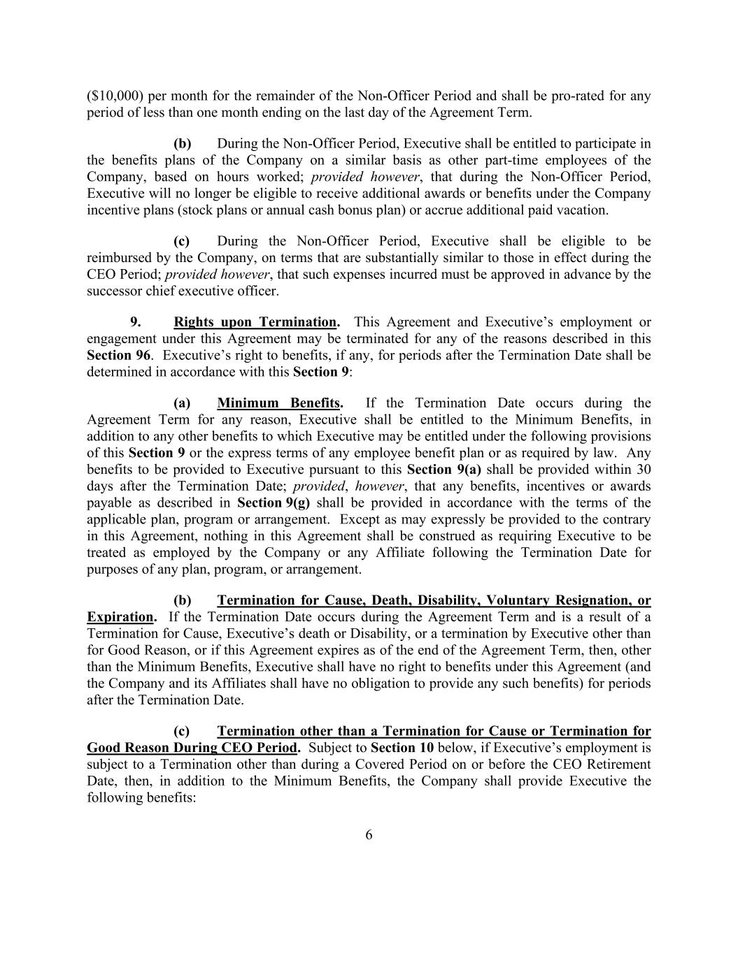 6 ($10,000) per month for the remainder of the Non-Officer Period and shall be pro-rated for any period of less than one month ending on the last day of the Agreement Term. (b) During the Non-Officer Period, Executive shall be entitled to participate in the benefits plans of the Company on a similar basis as other part-time employees of the Company, based on hours worked; provided however, that during the Non-Officer Period, Executive will no longer be eligible to receive additional awards or benefits under the Company incentive plans (stock plans or annual cash bonus plan) or accrue additional paid vacation. (c) During the Non-Officer Period, Executive shall be eligible to be reimbursed by the Company, on terms that are substantially similar to those in effect during the CEO Period; provided however, that such expenses incurred must be approved in advance by the successor chief executive officer. 9. Rights upon Termination. This Agreement and Executive’s employment or engagement under this Agreement may be terminated for any of the reasons described in this Section 96. Executive’s right to benefits, if any, for periods after the Termination Date shall be determined in accordance with this Section 9: (a) Minimum Benefits. If the Termination Date occurs during the Agreement Term for any reason, Executive shall be entitled to the Minimum Benefits, in addition to any other benefits to which Executive may be entitled under the following provisions of this Section 9 or the express terms of any employee benefit plan or as required by law. Any benefits to be provided to Executive pursuant to this Section 9(a) shall be provided within 30 days after the Termination Date; provided, however, that any benefits, incentives or awards payable as described in Section 9(g) shall be provided in accordance with the terms of the applicable plan, program or arrangement. Except as may expressly be provided to the contrary in this Agreement, nothing in this Agreement shall be construed as requiring Executive to be treated as employed by the Company or any Affiliate following the Termination Date for purposes of any plan, program, or arrangement. (b) Termination for Cause, Death, Disability, Voluntary Resignation, or Expiration. If the Termination Date occurs during the Agreement Term and is a result of a Termination for Cause, Executive’s death or Disability, or a termination by Executive other than for Good Reason, or if this Agreement expires as of the end of the Agreement Term, then, other than the Minimum Benefits, Executive shall have no right to benefits under this Agreement (and the Company and its Affiliates shall have no obligation to provide any such benefits) for periods after the Termination Date. (c) Termination other than a Termination for Cause or Termination for Good Reason During CEO Period. Subject to Section 10 below, if Executive’s employment is subject to a Termination other than during a Covered Period on or before the CEO Retirement Date, then, in addition to the Minimum Benefits, the Company shall provide Executive the following benefits: