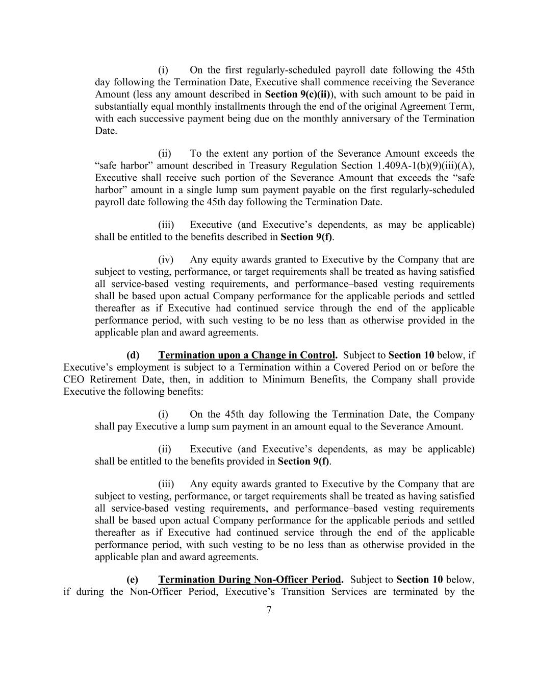 7 (i) On the first regularly-scheduled payroll date following the 45th day following the Termination Date, Executive shall commence receiving the Severance Amount (less any amount described in Section 9(c)(ii)), with such amount to be paid in substantially equal monthly installments through the end of the original Agreement Term, with each successive payment being due on the monthly anniversary of the Termination Date. (ii) To the extent any portion of the Severance Amount exceeds the “safe harbor” amount described in Treasury Regulation Section 1.409A-1(b)(9)(iii)(A), Executive shall receive such portion of the Severance Amount that exceeds the “safe harbor” amount in a single lump sum payment payable on the first regularly-scheduled payroll date following the 45th day following the Termination Date. (iii) Executive (and Executive’s dependents, as may be applicable) shall be entitled to the benefits described in Section 9(f). (iv) Any equity awards granted to Executive by the Company that are subject to vesting, performance, or target requirements shall be treated as having satisfied all service-based vesting requirements, and performance–based vesting requirements shall be based upon actual Company performance for the applicable periods and settled thereafter as if Executive had continued service through the end of the applicable performance period, with such vesting to be no less than as otherwise provided in the applicable plan and award agreements. (d) Termination upon a Change in Control. Subject to Section 10 below, if Executive’s employment is subject to a Termination within a Covered Period on or before the CEO Retirement Date, then, in addition to Minimum Benefits, the Company shall provide Executive the following benefits: (i) On the 45th day following the Termination Date, the Company shall pay Executive a lump sum payment in an amount equal to the Severance Amount. (ii) Executive (and Executive’s dependents, as may be applicable) shall be entitled to the benefits provided in Section 9(f). (iii) Any equity awards granted to Executive by the Company that are subject to vesting, performance, or target requirements shall be treated as having satisfied all service-based vesting requirements, and performance–based vesting requirements shall be based upon actual Company performance for the applicable periods and settled thereafter as if Executive had continued service through the end of the applicable performance period, with such vesting to be no less than as otherwise provided in the applicable plan and award agreements. (e) Termination During Non-Officer Period. Subject to Section 10 below, if during the Non-Officer Period, Executive’s Transition Services are terminated by the