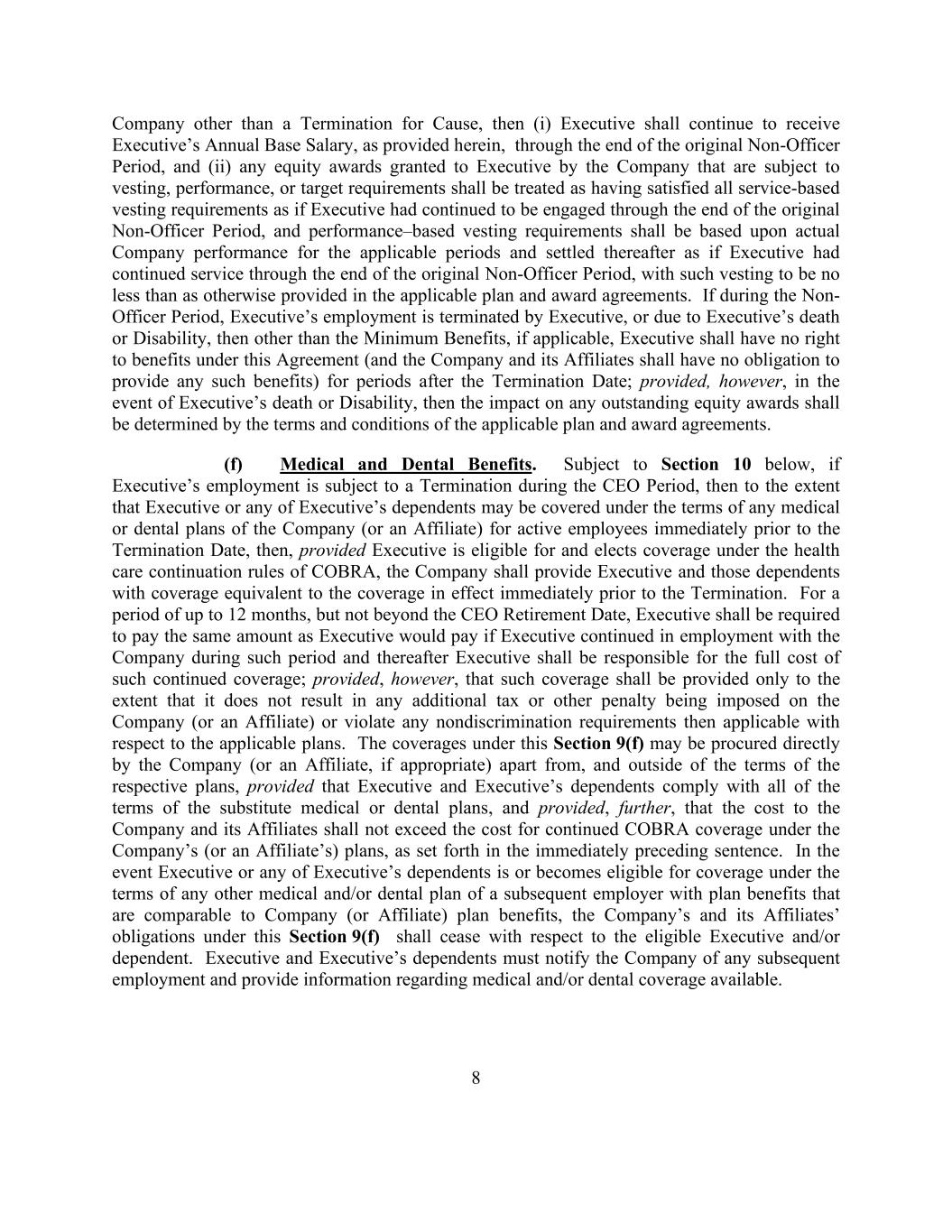 8 Company other than a Termination for Cause, then (i) Executive shall continue to receive Executive’s Annual Base Salary, as provided herein, through the end of the original Non-Officer Period, and (ii) any equity awards granted to Executive by the Company that are subject to vesting, performance, or target requirements shall be treated as having satisfied all service-based vesting requirements as if Executive had continued to be engaged through the end of the original Non-Officer Period, and performance–based vesting requirements shall be based upon actual Company performance for the applicable periods and settled thereafter as if Executive had continued service through the end of the original Non-Officer Period, with such vesting to be no less than as otherwise provided in the applicable plan and award agreements. If during the Non- Officer Period, Executive’s employment is terminated by Executive, or due to Executive’s death or Disability, then other than the Minimum Benefits, if applicable, Executive shall have no right to benefits under this Agreement (and the Company and its Affiliates shall have no obligation to provide any such benefits) for periods after the Termination Date; provided, however, in the event of Executive’s death or Disability, then the impact on any outstanding equity awards shall be determined by the terms and conditions of the applicable plan and award agreements. (f) Medical and Dental Benefits. Subject to Section 10 below, if Executive’s employment is subject to a Termination during the CEO Period, then to the extent that Executive or any of Executive’s dependents may be covered under the terms of any medical or dental plans of the Company (or an Affiliate) for active employees immediately prior to the Termination Date, then, provided Executive is eligible for and elects coverage under the health care continuation rules of COBRA, the Company shall provide Executive and those dependents with coverage equivalent to the coverage in effect immediately prior to the Termination. For a period of up to 12 months, but not beyond the CEO Retirement Date, Executive shall be required to pay the same amount as Executive would pay if Executive continued in employment with the Company during such period and thereafter Executive shall be responsible for the full cost of such continued coverage; provided, however, that such coverage shall be provided only to the extent that it does not result in any additional tax or other penalty being imposed on the Company (or an Affiliate) or violate any nondiscrimination requirements then applicable with respect to the applicable plans. The coverages under this Section 9(f) may be procured directly by the Company (or an Affiliate, if appropriate) apart from, and outside of the terms of the respective plans, provided that Executive and Executive’s dependents comply with all of the terms of the substitute medical or dental plans, and provided, further, that the cost to the Company and its Affiliates shall not exceed the cost for continued COBRA coverage under the Company’s (or an Affiliate’s) plans, as set forth in the immediately preceding sentence. In the event Executive or any of Executive’s dependents is or becomes eligible for coverage under the terms of any other medical and/or dental plan of a subsequent employer with plan benefits that are comparable to Company (or Affiliate) plan benefits, the Company’s and its Affiliates’ obligations under this Section 9(f) shall cease with respect to the eligible Executive and/or dependent. Executive and Executive’s dependents must notify the Company of any subsequent employment and provide information regarding medical and/or dental coverage available.