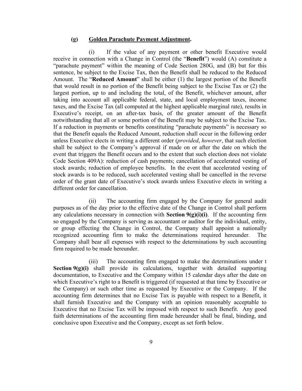 9 (g) Golden Parachute Payment Adjustment. (i) If the value of any payment or other benefit Executive would receive in connection with a Change in Control (the “Benefit”) would (A) constitute a “parachute payment” within the meaning of Code Section 280G, and (B) but for this sentence, be subject to the Excise Tax, then the Benefit shall be reduced to the Reduced Amount. The “Reduced Amount” shall be either (1) the largest portion of the Benefit that would result in no portion of the Benefit being subject to the Excise Tax or (2) the largest portion, up to and including the total, of the Benefit, whichever amount, after taking into account all applicable federal, state, and local employment taxes, income taxes, and the Excise Tax (all computed at the highest applicable marginal rate), results in Executive’s receipt, on an after-tax basis, of the greater amount of the Benefit notwithstanding that all or some portion of the Benefit may be subject to the Excise Tax. If a reduction in payments or benefits constituting “parachute payments” is necessary so that the Benefit equals the Reduced Amount, reduction shall occur in the following order unless Executive elects in writing a different order (provided, however, that such election shall be subject to the Company’s approval if made on or after the date on which the event that triggers the Benefit occurs and to the extent that such election does not violate Code Section 409A): reduction of cash payments; cancellation of accelerated vesting of stock awards; reduction of employee benefits. In the event that accelerated vesting of stock awards is to be reduced, such accelerated vesting shall be cancelled in the reverse order of the grant date of Executive’s stock awards unless Executive elects in writing a different order for cancellation. (ii) The accounting firm engaged by the Company for general audit purposes as of the day prior to the effective date of the Change in Control shall perform any calculations necessary in connection with Section 9(g)(i)(i). If the accounting firm so engaged by the Company is serving as accountant or auditor for the individual, entity, or group effecting the Change in Control, the Company shall appoint a nationally recognized accounting firm to make the determinations required hereunder. The Company shall bear all expenses with respect to the determinations by such accounting firm required to be made hereunder. (iii) The accounting firm engaged to make the determinations under t Section 9(g)(i) shall provide its calculations, together with detailed supporting documentation, to Executive and the Company within 15 calendar days after the date on which Executive’s right to a Benefit is triggered (if requested at that time by Executive or the Company) or such other time as requested by Executive or the Company. If the accounting firm determines that no Excise Tax is payable with respect to a Benefit, it shall furnish Executive and the Company with an opinion reasonably acceptable to Executive that no Excise Tax will be imposed with respect to such Benefit. Any good faith determinations of the accounting firm made hereunder shall be final, binding, and conclusive upon Executive and the Company, except as set forth below.