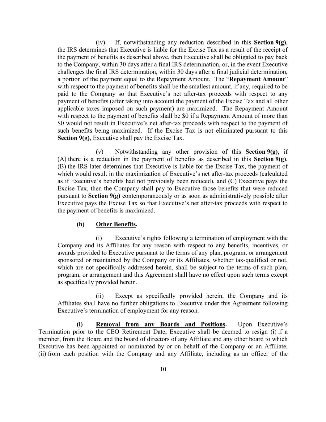 10 (iv) If, notwithstanding any reduction described in this Section 9(g), the IRS determines that Executive is liable for the Excise Tax as a result of the receipt of the payment of benefits as described above, then Executive shall be obligated to pay back to the Company, within 30 days after a final IRS determination, or, in the event Executive challenges the final IRS determination, within 30 days after a final judicial determination, a portion of the payment equal to the Repayment Amount. The “Repayment Amount” with respect to the payment of benefits shall be the smallest amount, if any, required to be paid to the Company so that Executive’s net after-tax proceeds with respect to any payment of benefits (after taking into account the payment of the Excise Tax and all other applicable taxes imposed on such payment) are maximized. The Repayment Amount with respect to the payment of benefits shall be $0 if a Repayment Amount of more than $0 would not result in Executive’s net after-tax proceeds with respect to the payment of such benefits being maximized. If the Excise Tax is not eliminated pursuant to this Section 9(g), Executive shall pay the Excise Tax. (v) Notwithstanding any other provision of this Section 9(g), if (A) there is a reduction in the payment of benefits as described in this Section 9(g), (B) the IRS later determines that Executive is liable for the Excise Tax, the payment of which would result in the maximization of Executive’s net after-tax proceeds (calculated as if Executive’s benefits had not previously been reduced), and (C) Executive pays the Excise Tax, then the Company shall pay to Executive those benefits that were reduced pursuant to Section 9(g) contemporaneously or as soon as administratively possible after Executive pays the Excise Tax so that Executive’s net after-tax proceeds with respect to the payment of benefits is maximized. (h) Other Benefits. (i) Executive’s rights following a termination of employment with the Company and its Affiliates for any reason with respect to any benefits, incentives, or awards provided to Executive pursuant to the terms of any plan, program, or arrangement sponsored or maintained by the Company or its Affiliates, whether tax-qualified or not, which are not specifically addressed herein, shall be subject to the terms of such plan, program, or arrangement and this Agreement shall have no effect upon such terms except as specifically provided herein. (ii) Except as specifically provided herein, the Company and its Affiliates shall have no further obligations to Executive under this Agreement following Executive’s termination of employment for any reason. (i) Removal from any Boards and Positions. Upon Executive’s Termination prior to the CEO Retirement Date, Executive shall be deemed to resign (i) if a member, from the Board and the board of directors of any Affiliate and any other board to which Executive has been appointed or nominated by or on behalf of the Company or an Affiliate, (ii) from each position with the Company and any Affiliate, including as an officer of the