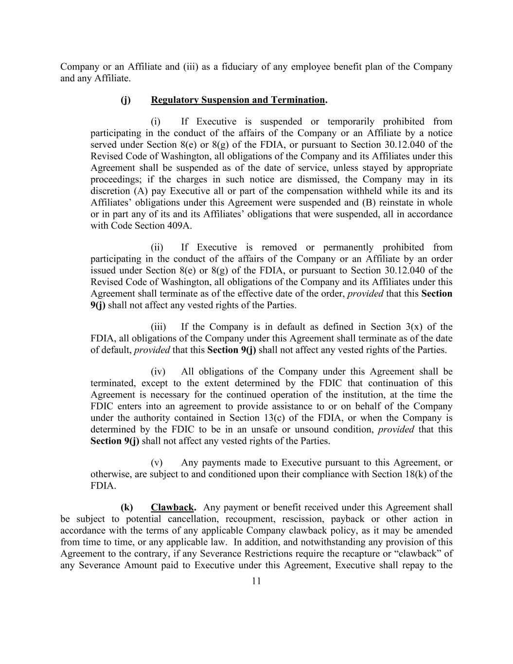 11 Company or an Affiliate and (iii) as a fiduciary of any employee benefit plan of the Company and any Affiliate. (j) Regulatory Suspension and Termination. (i) If Executive is suspended or temporarily prohibited from participating in the conduct of the affairs of the Company or an Affiliate by a notice served under Section 8(e) or 8(g) of the FDIA, or pursuant to Section 30.12.040 of the Revised Code of Washington, all obligations of the Company and its Affiliates under this Agreement shall be suspended as of the date of service, unless stayed by appropriate proceedings; if the charges in such notice are dismissed, the Company may in its discretion (A) pay Executive all or part of the compensation withheld while its and its Affiliates’ obligations under this Agreement were suspended and (B) reinstate in whole or in part any of its and its Affiliates’ obligations that were suspended, all in accordance with Code Section 409A. (ii) If Executive is removed or permanently prohibited from participating in the conduct of the affairs of the Company or an Affiliate by an order issued under Section 8(e) or 8(g) of the FDIA, or pursuant to Section 30.12.040 of the Revised Code of Washington, all obligations of the Company and its Affiliates under this Agreement shall terminate as of the effective date of the order, provided that this Section 9(j) shall not affect any vested rights of the Parties. (iii) If the Company is in default as defined in Section 3(x) of the FDIA, all obligations of the Company under this Agreement shall terminate as of the date of default, provided that this Section 9(j) shall not affect any vested rights of the Parties. (iv) All obligations of the Company under this Agreement shall be terminated, except to the extent determined by the FDIC that continuation of this Agreement is necessary for the continued operation of the institution, at the time the FDIC enters into an agreement to provide assistance to or on behalf of the Company under the authority contained in Section 13(c) of the FDIA, or when the Company is determined by the FDIC to be in an unsafe or unsound condition, provided that this Section 9(j) shall not affect any vested rights of the Parties. (v) Any payments made to Executive pursuant to this Agreement, or otherwise, are subject to and conditioned upon their compliance with Section 18(k) of the FDIA. (k) Clawback. Any payment or benefit received under this Agreement shall be subject to potential cancellation, recoupment, rescission, payback or other action in accordance with the terms of any applicable Company clawback policy, as it may be amended from time to time, or any applicable law. In addition, and notwithstanding any provision of this Agreement to the contrary, if any Severance Restrictions require the recapture or “clawback” of any Severance Amount paid to Executive under this Agreement, Executive shall repay to the