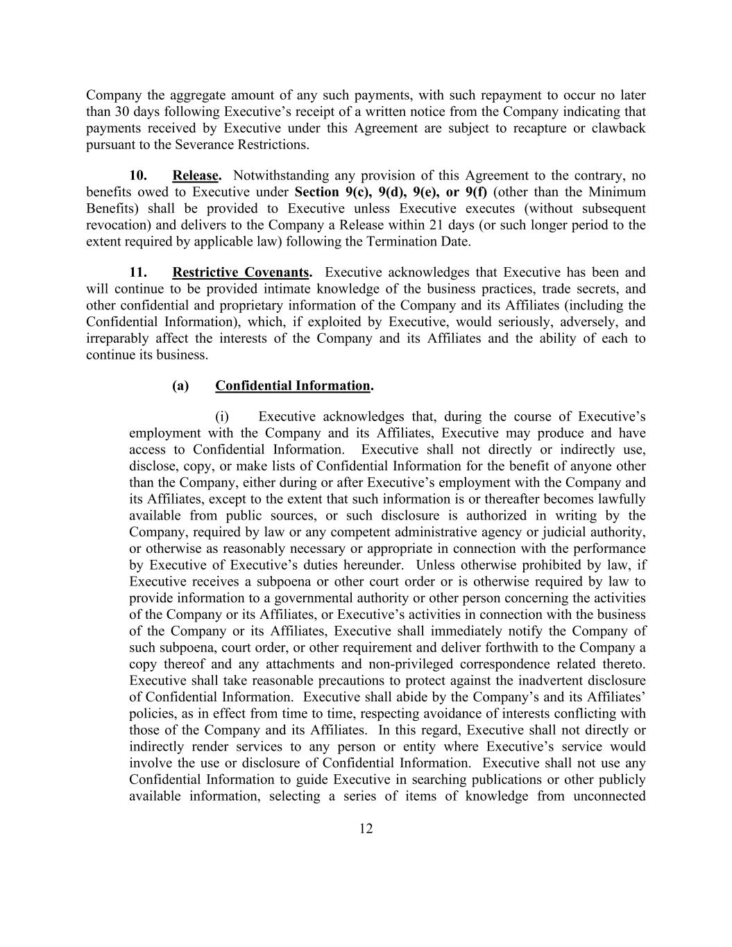 12 Company the aggregate amount of any such payments, with such repayment to occur no later than 30 days following Executive’s receipt of a written notice from the Company indicating that payments received by Executive under this Agreement are subject to recapture or clawback pursuant to the Severance Restrictions. 10. Release. Notwithstanding any provision of this Agreement to the contrary, no benefits owed to Executive under Section 9(c), 9(d), 9(e), or 9(f) (other than the Minimum Benefits) shall be provided to Executive unless Executive executes (without subsequent revocation) and delivers to the Company a Release within 21 days (or such longer period to the extent required by applicable law) following the Termination Date. 11. Restrictive Covenants. Executive acknowledges that Executive has been and will continue to be provided intimate knowledge of the business practices, trade secrets, and other confidential and proprietary information of the Company and its Affiliates (including the Confidential Information), which, if exploited by Executive, would seriously, adversely, and irreparably affect the interests of the Company and its Affiliates and the ability of each to continue its business. (a) Confidential Information. (i) Executive acknowledges that, during the course of Executive’s employment with the Company and its Affiliates, Executive may produce and have access to Confidential Information. Executive shall not directly or indirectly use, disclose, copy, or make lists of Confidential Information for the benefit of anyone other than the Company, either during or after Executive’s employment with the Company and its Affiliates, except to the extent that such information is or thereafter becomes lawfully available from public sources, or such disclosure is authorized in writing by the Company, required by law or any competent administrative agency or judicial authority, or otherwise as reasonably necessary or appropriate in connection with the performance by Executive of Executive’s duties hereunder. Unless otherwise prohibited by law, if Executive receives a subpoena or other court order or is otherwise required by law to provide information to a governmental authority or other person concerning the activities of the Company or its Affiliates, or Executive’s activities in connection with the business of the Company or its Affiliates, Executive shall immediately notify the Company of such subpoena, court order, or other requirement and deliver forthwith to the Company a copy thereof and any attachments and non-privileged correspondence related thereto. Executive shall take reasonable precautions to protect against the inadvertent disclosure of Confidential Information. Executive shall abide by the Company’s and its Affiliates’ policies, as in effect from time to time, respecting avoidance of interests conflicting with those of the Company and its Affiliates. In this regard, Executive shall not directly or indirectly render services to any person or entity where Executive’s service would involve the use or disclosure of Confidential Information. Executive shall not use any Confidential Information to guide Executive in searching publications or other publicly available information, selecting a series of items of knowledge from unconnected