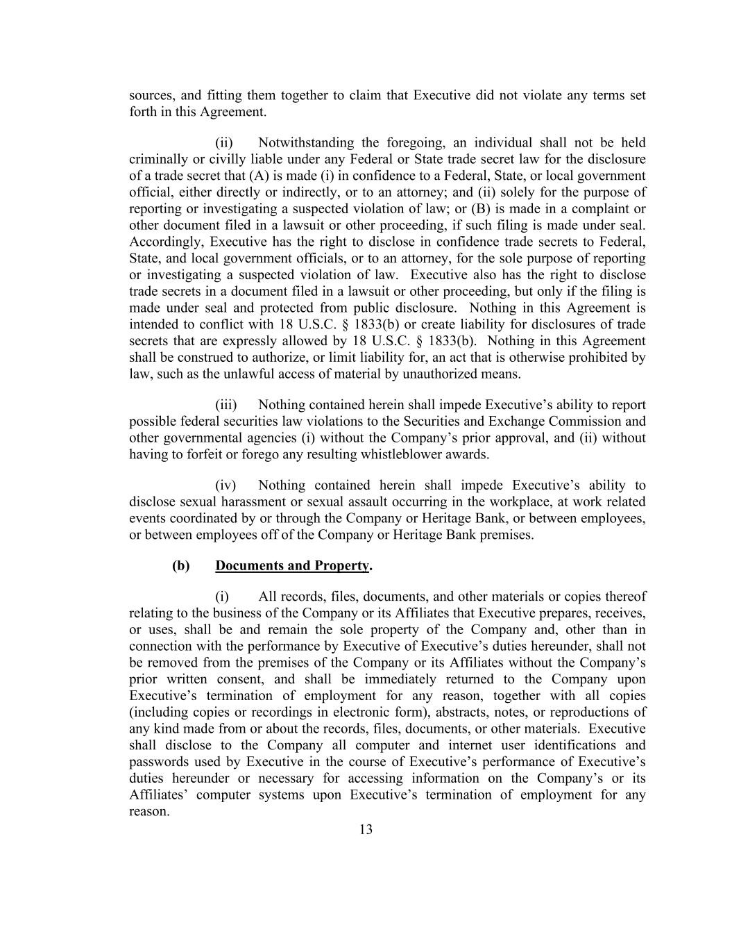 13 sources, and fitting them together to claim that Executive did not violate any terms set forth in this Agreement. (ii) Notwithstanding the foregoing, an individual shall not be held criminally or civilly liable under any Federal or State trade secret law for the disclosure of a trade secret that (A) is made (i) in confidence to a Federal, State, or local government official, either directly or indirectly, or to an attorney; and (ii) solely for the purpose of reporting or investigating a suspected violation of law; or (B) is made in a complaint or other document filed in a lawsuit or other proceeding, if such filing is made under seal. Accordingly, Executive has the right to disclose in confidence trade secrets to Federal, State, and local government officials, or to an attorney, for the sole purpose of reporting or investigating a suspected violation of law. Executive also has the right to disclose trade secrets in a document filed in a lawsuit or other proceeding, but only if the filing is made under seal and protected from public disclosure. Nothing in this Agreement is intended to conflict with 18 U.S.C. § 1833(b) or create liability for disclosures of trade secrets that are expressly allowed by 18 U.S.C. § 1833(b). Nothing in this Agreement shall be construed to authorize, or limit liability for, an act that is otherwise prohibited by law, such as the unlawful access of material by unauthorized means. (iii) Nothing contained herein shall impede Executive’s ability to report possible federal securities law violations to the Securities and Exchange Commission and other governmental agencies (i) without the Company’s prior approval, and (ii) without having to forfeit or forego any resulting whistleblower awards. (iv) Nothing contained herein shall impede Executive’s ability to disclose sexual harassment or sexual assault occurring in the workplace, at work related events coordinated by or through the Company or Heritage Bank, or between employees, or between employees off of the Company or Heritage Bank premises. (b) Documents and Property. (i) All records, files, documents, and other materials or copies thereof relating to the business of the Company or its Affiliates that Executive prepares, receives, or uses, shall be and remain the sole property of the Company and, other than in connection with the performance by Executive of Executive’s duties hereunder, shall not be removed from the premises of the Company or its Affiliates without the Company’s prior written consent, and shall be immediately returned to the Company upon Executive’s termination of employment for any reason, together with all copies (including copies or recordings in electronic form), abstracts, notes, or reproductions of any kind made from or about the records, files, documents, or other materials. Executive shall disclose to the Company all computer and internet user identifications and passwords used by Executive in the course of Executive’s performance of Executive’s duties hereunder or necessary for accessing information on the Company’s or its Affiliates’ computer systems upon Executive’s termination of employment for any reason.