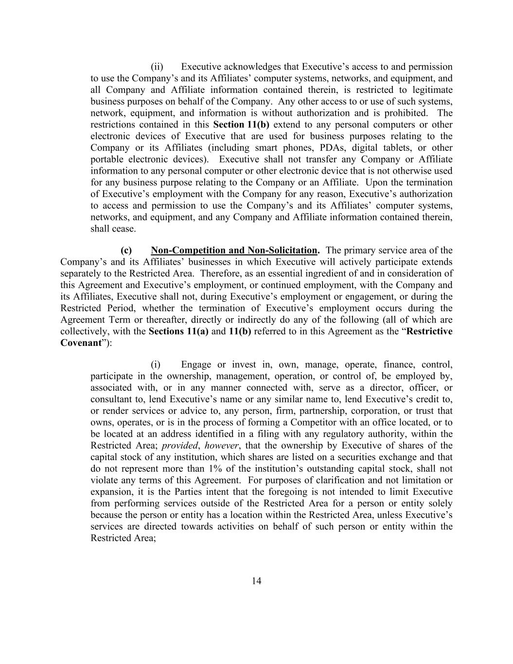 14 (ii) Executive acknowledges that Executive’s access to and permission to use the Company’s and its Affiliates’ computer systems, networks, and equipment, and all Company and Affiliate information contained therein, is restricted to legitimate business purposes on behalf of the Company. Any other access to or use of such systems, network, equipment, and information is without authorization and is prohibited. The restrictions contained in this Section 11(b) extend to any personal computers or other electronic devices of Executive that are used for business purposes relating to the Company or its Affiliates (including smart phones, PDAs, digital tablets, or other portable electronic devices). Executive shall not transfer any Company or Affiliate information to any personal computer or other electronic device that is not otherwise used for any business purpose relating to the Company or an Affiliate. Upon the termination of Executive’s employment with the Company for any reason, Executive’s authorization to access and permission to use the Company’s and its Affiliates’ computer systems, networks, and equipment, and any Company and Affiliate information contained therein, shall cease. (c) Non-Competition and Non-Solicitation. The primary service area of the Company’s and its Affiliates’ businesses in which Executive will actively participate extends separately to the Restricted Area. Therefore, as an essential ingredient of and in consideration of this Agreement and Executive’s employment, or continued employment, with the Company and its Affiliates, Executive shall not, during Executive’s employment or engagement, or during the Restricted Period, whether the termination of Executive’s employment occurs during the Agreement Term or thereafter, directly or indirectly do any of the following (all of which are collectively, with the Sections 11(a) and 11(b) referred to in this Agreement as the “Restrictive Covenant”): (i) Engage or invest in, own, manage, operate, finance, control, participate in the ownership, management, operation, or control of, be employed by, associated with, or in any manner connected with, serve as a director, officer, or consultant to, lend Executive’s name or any similar name to, lend Executive’s credit to, or render services or advice to, any person, firm, partnership, corporation, or trust that owns, operates, or is in the process of forming a Competitor with an office located, or to be located at an address identified in a filing with any regulatory authority, within the Restricted Area; provided, however, that the ownership by Executive of shares of the capital stock of any institution, which shares are listed on a securities exchange and that do not represent more than 1% of the institution’s outstanding capital stock, shall not violate any terms of this Agreement. For purposes of clarification and not limitation or expansion, it is the Parties intent that the foregoing is not intended to limit Executive from performing services outside of the Restricted Area for a person or entity solely because the person or entity has a location within the Restricted Area, unless Executive’s services are directed towards activities on behalf of such person or entity within the Restricted Area;