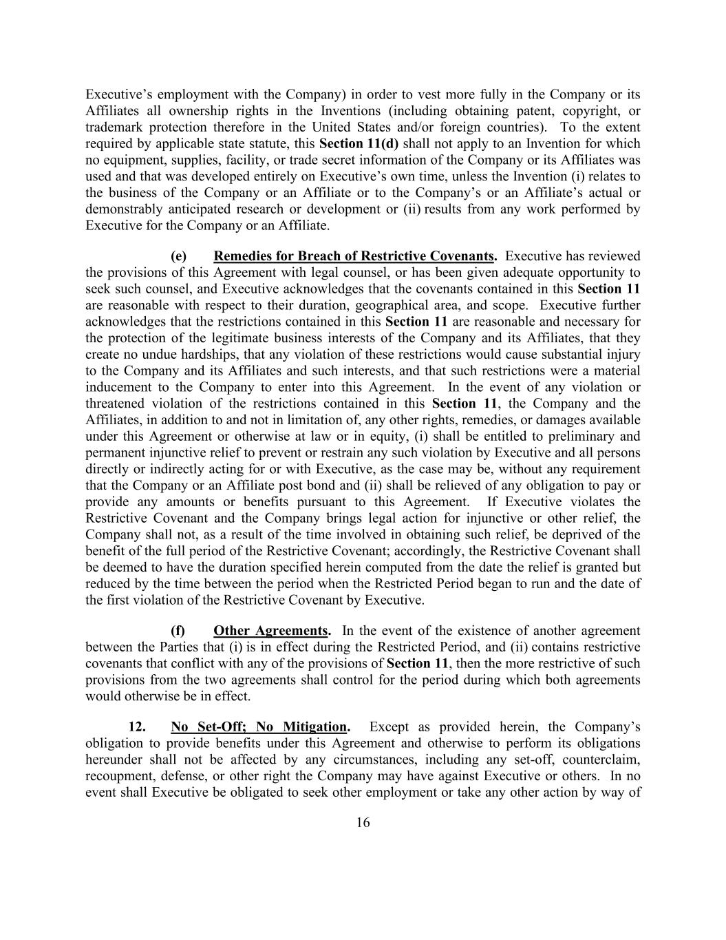 16 Executive’s employment with the Company) in order to vest more fully in the Company or its Affiliates all ownership rights in the Inventions (including obtaining patent, copyright, or trademark protection therefore in the United States and/or foreign countries). To the extent required by applicable state statute, this Section 11(d) shall not apply to an Invention for which no equipment, supplies, facility, or trade secret information of the Company or its Affiliates was used and that was developed entirely on Executive’s own time, unless the Invention (i) relates to the business of the Company or an Affiliate or to the Company’s or an Affiliate’s actual or demonstrably anticipated research or development or (ii) results from any work performed by Executive for the Company or an Affiliate. (e) Remedies for Breach of Restrictive Covenants. Executive has reviewed the provisions of this Agreement with legal counsel, or has been given adequate opportunity to seek such counsel, and Executive acknowledges that the covenants contained in this Section 11 are reasonable with respect to their duration, geographical area, and scope. Executive further acknowledges that the restrictions contained in this Section 11 are reasonable and necessary for the protection of the legitimate business interests of the Company and its Affiliates, that they create no undue hardships, that any violation of these restrictions would cause substantial injury to the Company and its Affiliates and such interests, and that such restrictions were a material inducement to the Company to enter into this Agreement. In the event of any violation or threatened violation of the restrictions contained in this Section 11, the Company and the Affiliates, in addition to and not in limitation of, any other rights, remedies, or damages available under this Agreement or otherwise at law or in equity, (i) shall be entitled to preliminary and permanent injunctive relief to prevent or restrain any such violation by Executive and all persons directly or indirectly acting for or with Executive, as the case may be, without any requirement that the Company or an Affiliate post bond and (ii) shall be relieved of any obligation to pay or provide any amounts or benefits pursuant to this Agreement. If Executive violates the Restrictive Covenant and the Company brings legal action for injunctive or other relief, the Company shall not, as a result of the time involved in obtaining such relief, be deprived of the benefit of the full period of the Restrictive Covenant; accordingly, the Restrictive Covenant shall be deemed to have the duration specified herein computed from the date the relief is granted but reduced by the time between the period when the Restricted Period began to run and the date of the first violation of the Restrictive Covenant by Executive. (f) Other Agreements. In the event of the existence of another agreement between the Parties that (i) is in effect during the Restricted Period, and (ii) contains restrictive covenants that conflict with any of the provisions of Section 11, then the more restrictive of such provisions from the two agreements shall control for the period during which both agreements would otherwise be in effect. 12. No Set-Off; No Mitigation. Except as provided herein, the Company’s obligation to provide benefits under this Agreement and otherwise to perform its obligations hereunder shall not be affected by any circumstances, including any set-off, counterclaim, recoupment, defense, or other right the Company may have against Executive or others. In no event shall Executive be obligated to seek other employment or take any other action by way of