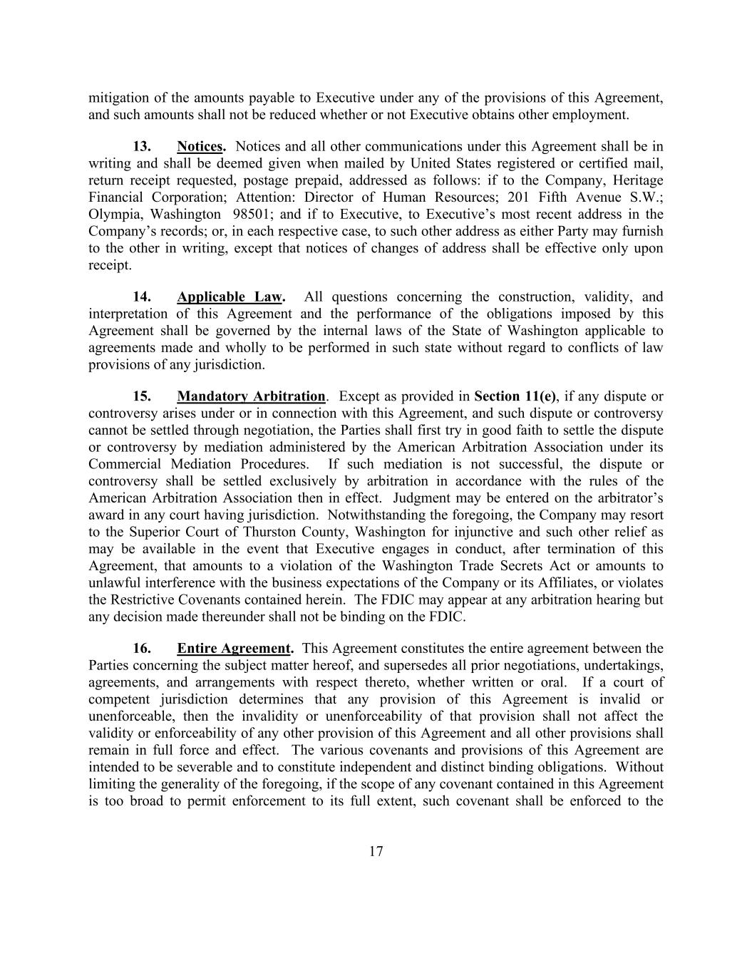 17 mitigation of the amounts payable to Executive under any of the provisions of this Agreement, and such amounts shall not be reduced whether or not Executive obtains other employment. 13. Notices. Notices and all other communications under this Agreement shall be in writing and shall be deemed given when mailed by United States registered or certified mail, return receipt requested, postage prepaid, addressed as follows: if to the Company, Heritage Financial Corporation; Attention: Director of Human Resources; 201 Fifth Avenue S.W.; Olympia, Washington 98501; and if to Executive, to Executive’s most recent address in the Company’s records; or, in each respective case, to such other address as either Party may furnish to the other in writing, except that notices of changes of address shall be effective only upon receipt. 14. Applicable Law. All questions concerning the construction, validity, and interpretation of this Agreement and the performance of the obligations imposed by this Agreement shall be governed by the internal laws of the State of Washington applicable to agreements made and wholly to be performed in such state without regard to conflicts of law provisions of any jurisdiction. 15. Mandatory Arbitration. Except as provided in Section 11(e), if any dispute or controversy arises under or in connection with this Agreement, and such dispute or controversy cannot be settled through negotiation, the Parties shall first try in good faith to settle the dispute or controversy by mediation administered by the American Arbitration Association under its Commercial Mediation Procedures. If such mediation is not successful, the dispute or controversy shall be settled exclusively by arbitration in accordance with the rules of the American Arbitration Association then in effect. Judgment may be entered on the arbitrator’s award in any court having jurisdiction. Notwithstanding the foregoing, the Company may resort to the Superior Court of Thurston County, Washington for injunctive and such other relief as may be available in the event that Executive engages in conduct, after termination of this Agreement, that amounts to a violation of the Washington Trade Secrets Act or amounts to unlawful interference with the business expectations of the Company or its Affiliates, or violates the Restrictive Covenants contained herein. The FDIC may appear at any arbitration hearing but any decision made thereunder shall not be binding on the FDIC. 16. Entire Agreement. This Agreement constitutes the entire agreement between the Parties concerning the subject matter hereof, and supersedes all prior negotiations, undertakings, agreements, and arrangements with respect thereto, whether written or oral. If a court of competent jurisdiction determines that any provision of this Agreement is invalid or unenforceable, then the invalidity or unenforceability of that provision shall not affect the validity or enforceability of any other provision of this Agreement and all other provisions shall remain in full force and effect. The various covenants and provisions of this Agreement are intended to be severable and to constitute independent and distinct binding obligations. Without limiting the generality of the foregoing, if the scope of any covenant contained in this Agreement is too broad to permit enforcement to its full extent, such covenant shall be enforced to the