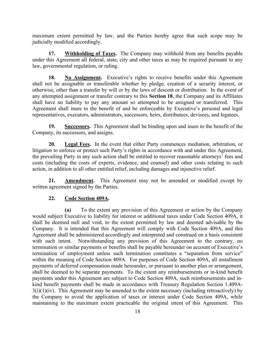 18 maximum extent permitted by law, and the Parties hereby agree that such scope may be judicially modified accordingly. 17. Withholding of Taxes. The Company may withhold from any benefits payable under this Agreement all federal, state, city and other taxes as may be required pursuant to any law, governmental regulation, or ruling. 18. No Assignment. Executive’s rights to receive benefits under this Agreement shall not be assignable or transferable whether by pledge, creation of a security interest, or otherwise, other than a transfer by will or by the laws of descent or distribution. In the event of any attempted assignment or transfer contrary to this Section 18, the Company and its Affiliates shall have no liability to pay any amount so attempted to be assigned or transferred. This Agreement shall inure to the benefit of and be enforceable by Executive’s personal and legal representatives, executors, administrators, successors, heirs, distributees, devisees, and legatees. 19. Successors. This Agreement shall be binding upon and inure to the benefit of the Company, its successors, and assigns. 20. Legal Fees. In the event that either Party commences mediation, arbitration, or litigation to enforce or protect such Party’s rights in accordance with and under this Agreement, the prevailing Party in any such action shall be entitled to recover reasonable attorneys’ fees and costs (including the costs of experts, evidence, and counsel) and other costs relating to such action, in addition to all other entitled relief, including damages and injunctive relief. 21. Amendment. This Agreement may not be amended or modified except by written agreement signed by the Parties. 22. Code Section 409A. (a) To the extent any provision of this Agreement or action by the Company would subject Executive to liability for interest or additional taxes under Code Section 409A, it shall be deemed null and void, to the extent permitted by law and deemed advisable by the Company. It is intended that this Agreement will comply with Code Section 409A, and this Agreement shall be administered accordingly and interpreted and construed on a basis consistent with such intent. Notwithstanding any provision of this Agreement to the contrary, no termination or similar payments or benefits shall be payable hereunder on account of Executive’s termination of employment unless such termination constitutes a “separation from service” within the meaning of Code Section 409A. For purposes of Code Section 409A, all installment payments of deferred compensation made hereunder, or pursuant to another plan or arrangement, shall be deemed to be separate payments. To the extent any reimbursements or in-kind benefit payments under this Agreement are subject to Code Section 409A, such reimbursements and in- kind benefit payments shall be made in accordance with Treasury Regulation Section 1.409A- 3(i)(1)(iv). This Agreement may be amended to the extent necessary (including retroactively) by the Company to avoid the application of taxes or interest under Code Section 409A, while maintaining to the maximum extent practicable the original intent of this Agreement. This