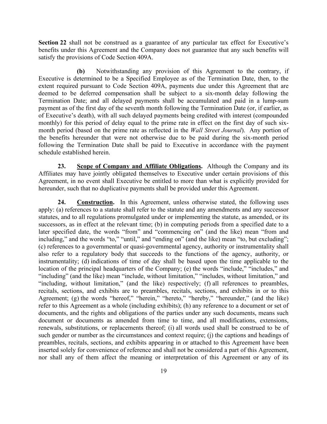 19 Section 22 shall not be construed as a guarantee of any particular tax effect for Executive’s benefits under this Agreement and the Company does not guarantee that any such benefits will satisfy the provisions of Code Section 409A. (b) Notwithstanding any provision of this Agreement to the contrary, if Executive is determined to be a Specified Employee as of the Termination Date, then, to the extent required pursuant to Code Section 409A, payments due under this Agreement that are deemed to be deferred compensation shall be subject to a six-month delay following the Termination Date; and all delayed payments shall be accumulated and paid in a lump-sum payment as of the first day of the seventh month following the Termination Date (or, if earlier, as of Executive’s death), with all such delayed payments being credited with interest (compounded monthly) for this period of delay equal to the prime rate in effect on the first day of such six- month period (based on the prime rate as reflected in the Wall Street Journal). Any portion of the benefits hereunder that were not otherwise due to be paid during the six-month period following the Termination Date shall be paid to Executive in accordance with the payment schedule established herein. 23. Scope of Company and Affiliate Obligations. Although the Company and its Affiliates may have jointly obligated themselves to Executive under certain provisions of this Agreement, in no event shall Executive be entitled to more than what is explicitly provided for hereunder, such that no duplicative payments shall be provided under this Agreement. 24. Construction. In this Agreement, unless otherwise stated, the following uses apply: (a) references to a statute shall refer to the statute and any amendments and any successor statutes, and to all regulations promulgated under or implementing the statute, as amended, or its successors, as in effect at the relevant time; (b) in computing periods from a specified date to a later specified date, the words “from” and “commencing on” (and the like) mean “from and including,” and the words “to,” “until,” and “ending on” (and the like) mean “to, but excluding”; (c) references to a governmental or quasi-governmental agency, authority or instrumentality shall also refer to a regulatory body that succeeds to the functions of the agency, authority, or instrumentality; (d) indications of time of day shall be based upon the time applicable to the location of the principal headquarters of the Company; (e) the words “include,” “includes,” and “including” (and the like) mean “include, without limitation,” “includes, without limitation,” and “including, without limitation,” (and the like) respectively; (f) all references to preambles, recitals, sections, and exhibits are to preambles, recitals, sections, and exhibits in or to this Agreement; (g) the words “hereof,” “herein,” “hereto,” “hereby,” “hereunder,” (and the like) refer to this Agreement as a whole (including exhibits); (h) any reference to a document or set of documents, and the rights and obligations of the parties under any such documents, means such document or documents as amended from time to time, and all modifications, extensions, renewals, substitutions, or replacements thereof; (i) all words used shall be construed to be of such gender or number as the circumstances and context require; (j) the captions and headings of preambles, recitals, sections, and exhibits appearing in or attached to this Agreement have been inserted solely for convenience of reference and shall not be considered a part of this Agreement, nor shall any of them affect the meaning or interpretation of this Agreement or any of its