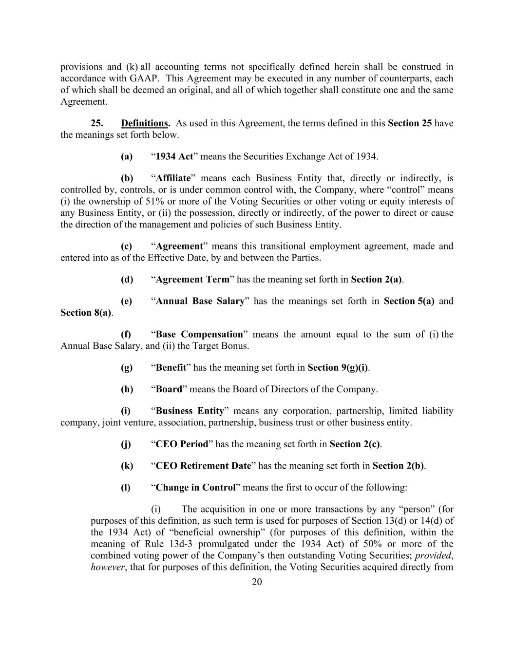 20 provisions and (k) all accounting terms not specifically defined herein shall be construed in accordance with GAAP. This Agreement may be executed in any number of counterparts, each of which shall be deemed an original, and all of which together shall constitute one and the same Agreement. 25. Definitions. As used in this Agreement, the terms defined in this Section 25 have the meanings set forth below. (a) “1934 Act” means the Securities Exchange Act of 1934. (b) “Affiliate” means each Business Entity that, directly or indirectly, is controlled by, controls, or is under common control with, the Company, where “control” means (i) the ownership of 51% or more of the Voting Securities or other voting or equity interests of any Business Entity, or (ii) the possession, directly or indirectly, of the power to direct or cause the direction of the management and policies of such Business Entity. (c) “Agreement” means this transitional employment agreement, made and entered into as of the Effective Date, by and between the Parties. (d) “Agreement Term” has the meaning set forth in Section 2(a). (e) “Annual Base Salary” has the meanings set forth in Section 5(a) and Section 8(a). (f) “Base Compensation” means the amount equal to the sum of (i) the Annual Base Salary, and (ii) the Target Bonus. (g) “Benefit” has the meaning set forth in Section 9(g)(i). (h) “Board” means the Board of Directors of the Company. (i) “Business Entity” means any corporation, partnership, limited liability company, joint venture, association, partnership, business trust or other business entity. (j) “CEO Period” has the meaning set forth in Section 2(c). (k) “CEO Retirement Date” has the meaning set forth in Section 2(b). (l) “Change in Control” means the first to occur of the following: (i) The acquisition in one or more transactions by any “person” (for purposes of this definition, as such term is used for purposes of Section 13(d) or 14(d) of the 1934 Act) of “beneficial ownership” (for purposes of this definition, within the meaning of Rule 13d-3 promulgated under the 1934 Act) of 50% or more of the combined voting power of the Company’s then outstanding Voting Securities; provided, however, that for purposes of this definition, the Voting Securities acquired directly from