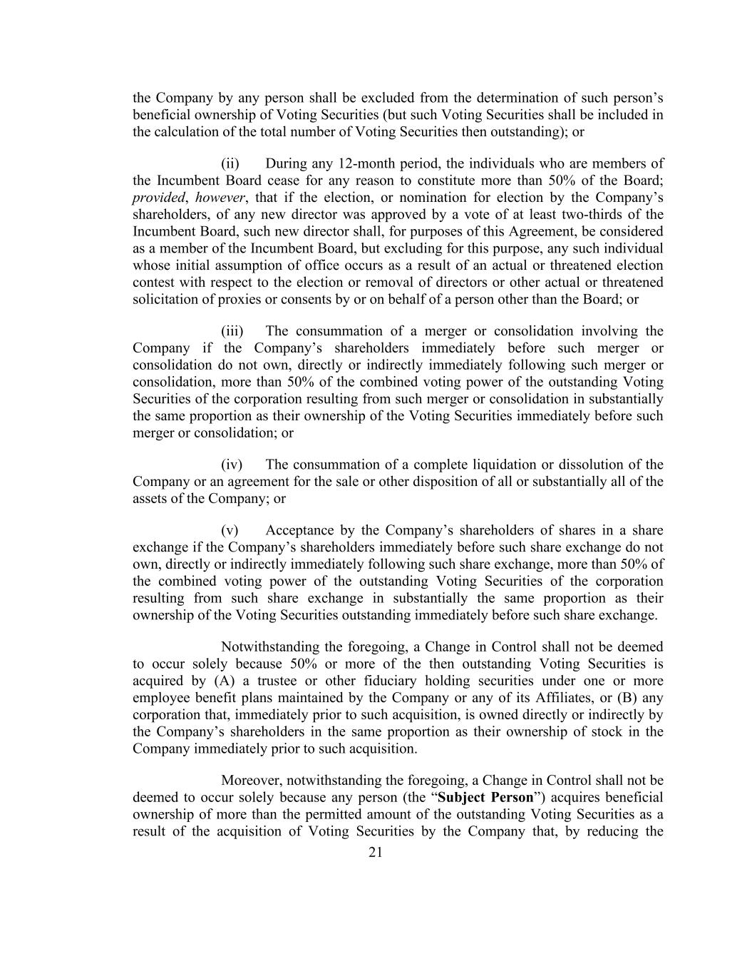 21 the Company by any person shall be excluded from the determination of such person’s beneficial ownership of Voting Securities (but such Voting Securities shall be included in the calculation of the total number of Voting Securities then outstanding); or (ii) During any 12-month period, the individuals who are members of the Incumbent Board cease for any reason to constitute more than 50% of the Board; provided, however, that if the election, or nomination for election by the Company’s shareholders, of any new director was approved by a vote of at least two-thirds of the Incumbent Board, such new director shall, for purposes of this Agreement, be considered as a member of the Incumbent Board, but excluding for this purpose, any such individual whose initial assumption of office occurs as a result of an actual or threatened election contest with respect to the election or removal of directors or other actual or threatened solicitation of proxies or consents by or on behalf of a person other than the Board; or (iii) The consummation of a merger or consolidation involving the Company if the Company’s shareholders immediately before such merger or consolidation do not own, directly or indirectly immediately following such merger or consolidation, more than 50% of the combined voting power of the outstanding Voting Securities of the corporation resulting from such merger or consolidation in substantially the same proportion as their ownership of the Voting Securities immediately before such merger or consolidation; or (iv) The consummation of a complete liquidation or dissolution of the Company or an agreement for the sale or other disposition of all or substantially all of the assets of the Company; or (v) Acceptance by the Company’s shareholders of shares in a share exchange if the Company’s shareholders immediately before such share exchange do not own, directly or indirectly immediately following such share exchange, more than 50% of the combined voting power of the outstanding Voting Securities of the corporation resulting from such share exchange in substantially the same proportion as their ownership of the Voting Securities outstanding immediately before such share exchange. Notwithstanding the foregoing, a Change in Control shall not be deemed to occur solely because 50% or more of the then outstanding Voting Securities is acquired by (A) a trustee or other fiduciary holding securities under one or more employee benefit plans maintained by the Company or any of its Affiliates, or (B) any corporation that, immediately prior to such acquisition, is owned directly or indirectly by the Company’s shareholders in the same proportion as their ownership of stock in the Company immediately prior to such acquisition. Moreover, notwithstanding the foregoing, a Change in Control shall not be deemed to occur solely because any person (the “Subject Person”) acquires beneficial ownership of more than the permitted amount of the outstanding Voting Securities as a result of the acquisition of Voting Securities by the Company that, by reducing the