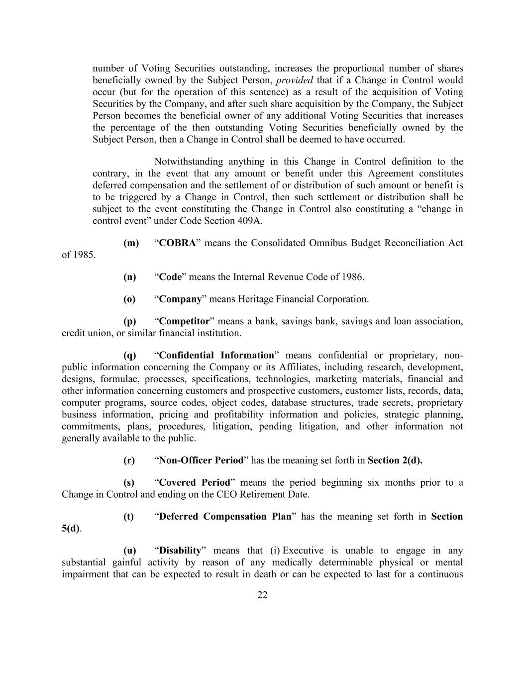 22 number of Voting Securities outstanding, increases the proportional number of shares beneficially owned by the Subject Person, provided that if a Change in Control would occur (but for the operation of this sentence) as a result of the acquisition of Voting Securities by the Company, and after such share acquisition by the Company, the Subject Person becomes the beneficial owner of any additional Voting Securities that increases the percentage of the then outstanding Voting Securities beneficially owned by the Subject Person, then a Change in Control shall be deemed to have occurred. Notwithstanding anything in this Change in Control definition to the contrary, in the event that any amount or benefit under this Agreement constitutes deferred compensation and the settlement of or distribution of such amount or benefit is to be triggered by a Change in Control, then such settlement or distribution shall be subject to the event constituting the Change in Control also constituting a “change in control event” under Code Section 409A. (m) “COBRA” means the Consolidated Omnibus Budget Reconciliation Act of 1985. (n) “Code” means the Internal Revenue Code of 1986. (o) “Company” means Heritage Financial Corporation. (p) “Competitor” means a bank, savings bank, savings and loan association, credit union, or similar financial institution. (q) “Confidential Information” means confidential or proprietary, non- public information concerning the Company or its Affiliates, including research, development, designs, formulae, processes, specifications, technologies, marketing materials, financial and other information concerning customers and prospective customers, customer lists, records, data, computer programs, source codes, object codes, database structures, trade secrets, proprietary business information, pricing and profitability information and policies, strategic planning, commitments, plans, procedures, litigation, pending litigation, and other information not generally available to the public. (r) “Non-Officer Period” has the meaning set forth in Section 2(d). (s) “Covered Period” means the period beginning six months prior to a Change in Control and ending on the CEO Retirement Date. (t) “Deferred Compensation Plan” has the meaning set forth in Section 5(d). (u) “Disability” means that (i) Executive is unable to engage in any substantial gainful activity by reason of any medically determinable physical or mental impairment that can be expected to result in death or can be expected to last for a continuous