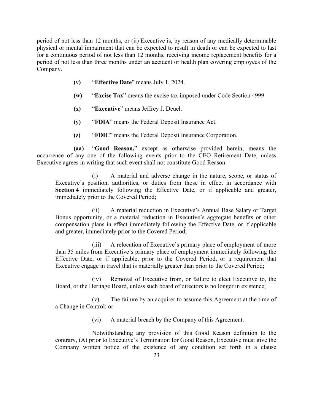23 period of not less than 12 months, or (ii) Executive is, by reason of any medically determinable physical or mental impairment that can be expected to result in death or can be expected to last for a continuous period of not less than 12 months, receiving income replacement benefits for a period of not less than three months under an accident or health plan covering employees of the Company. (v) “Effective Date” means July 1, 2024. (w) “Excise Tax” means the excise tax imposed under Code Section 4999. (x) “Executive” means Jeffrey J. Deuel. (y) “FDIA” means the Federal Deposit Insurance Act. (z) “FDIC” means the Federal Deposit Insurance Corporation. (aa) “Good Reason,” except as otherwise provided herein, means the occurrence of any one of the following events prior to the CEO Retirement Date, unless Executive agrees in writing that such event shall not constitute Good Reason: (i) A material and adverse change in the nature, scope, or status of Executive’s position, authorities, or duties from those in effect in accordance with Section 4 immediately following the Effective Date, or if applicable and greater, immediately prior to the Covered Period; (ii) A material reduction in Executive’s Annual Base Salary or Target Bonus opportunity, or a material reduction in Executive’s aggregate benefits or other compensation plans in effect immediately following the Effective Date, or if applicable and greater, immediately prior to the Covered Period; (iii) A relocation of Executive’s primary place of employment of more than 35 miles from Executive’s primary place of employment immediately following the Effective Date, or if applicable, prior to the Covered Period, or a requirement that Executive engage in travel that is materially greater than prior to the Covered Period; (iv) Removal of Executive from, or failure to elect Executive to, the Board, or the Heritage Board, unless such board of directors is no longer in existence; (v) The failure by an acquirer to assume this Agreement at the time of a Change in Control; or (vi) A material breach by the Company of this Agreement. Notwithstanding any provision of this Good Reason definition to the contrary, (A) prior to Executive’s Termination for Good Reason, Executive must give the Company written notice of the existence of any condition set forth in a clause