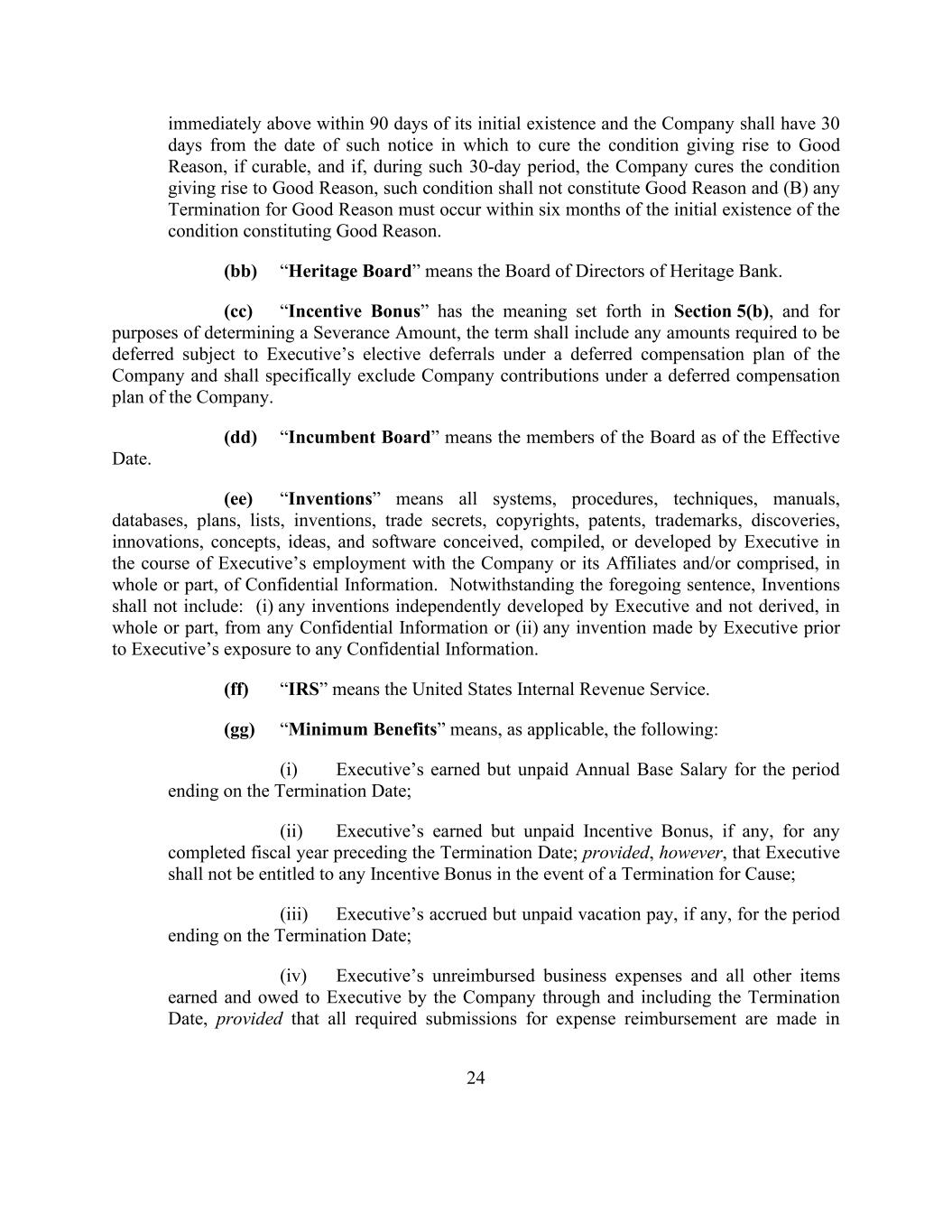 24 immediately above within 90 days of its initial existence and the Company shall have 30 days from the date of such notice in which to cure the condition giving rise to Good Reason, if curable, and if, during such 30-day period, the Company cures the condition giving rise to Good Reason, such condition shall not constitute Good Reason and (B) any Termination for Good Reason must occur within six months of the initial existence of the condition constituting Good Reason. (bb) “Heritage Board” means the Board of Directors of Heritage Bank. (cc) “Incentive Bonus” has the meaning set forth in Section 5(b), and for purposes of determining a Severance Amount, the term shall include any amounts required to be deferred subject to Executive’s elective deferrals under a deferred compensation plan of the Company and shall specifically exclude Company contributions under a deferred compensation plan of the Company. (dd) “Incumbent Board” means the members of the Board as of the Effective Date. (ee) “Inventions” means all systems, procedures, techniques, manuals, databases, plans, lists, inventions, trade secrets, copyrights, patents, trademarks, discoveries, innovations, concepts, ideas, and software conceived, compiled, or developed by Executive in the course of Executive’s employment with the Company or its Affiliates and/or comprised, in whole or part, of Confidential Information. Notwithstanding the foregoing sentence, Inventions shall not include: (i) any inventions independently developed by Executive and not derived, in whole or part, from any Confidential Information or (ii) any invention made by Executive prior to Executive’s exposure to any Confidential Information. (ff) “IRS” means the United States Internal Revenue Service. (gg) “Minimum Benefits” means, as applicable, the following: (i) Executive’s earned but unpaid Annual Base Salary for the period ending on the Termination Date; (ii) Executive’s earned but unpaid Incentive Bonus, if any, for any completed fiscal year preceding the Termination Date; provided, however, that Executive shall not be entitled to any Incentive Bonus in the event of a Termination for Cause; (iii) Executive’s accrued but unpaid vacation pay, if any, for the period ending on the Termination Date; (iv) Executive’s unreimbursed business expenses and all other items earned and owed to Executive by the Company through and including the Termination Date, provided that all required submissions for expense reimbursement are made in