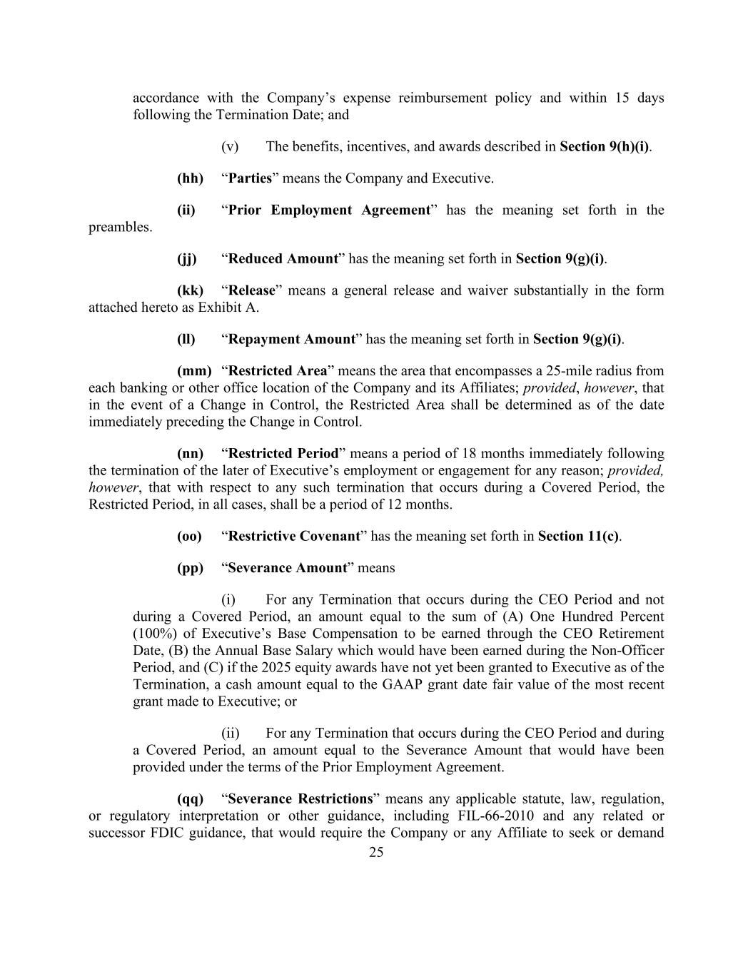 25 accordance with the Company’s expense reimbursement policy and within 15 days following the Termination Date; and (v) The benefits, incentives, and awards described in Section 9(h)(i). (hh) “Parties” means the Company and Executive. (ii) “Prior Employment Agreement” has the meaning set forth in the preambles. (jj) “Reduced Amount” has the meaning set forth in Section 9(g)(i). (kk) “Release” means a general release and waiver substantially in the form attached hereto as Exhibit A. (ll) “Repayment Amount” has the meaning set forth in Section 9(g)(i). (mm) “Restricted Area” means the area that encompasses a 25-mile radius from each banking or other office location of the Company and its Affiliates; provided, however, that in the event of a Change in Control, the Restricted Area shall be determined as of the date immediately preceding the Change in Control. (nn) “Restricted Period” means a period of 18 months immediately following the termination of the later of Executive’s employment or engagement for any reason; provided, however, that with respect to any such termination that occurs during a Covered Period, the Restricted Period, in all cases, shall be a period of 12 months. (oo) “Restrictive Covenant” has the meaning set forth in Section 11(c). (pp) “Severance Amount” means (i) For any Termination that occurs during the CEO Period and not during a Covered Period, an amount equal to the sum of (A) One Hundred Percent (100%) of Executive’s Base Compensation to be earned through the CEO Retirement Date, (B) the Annual Base Salary which would have been earned during the Non-Officer Period, and (C) if the 2025 equity awards have not yet been granted to Executive as of the Termination, a cash amount equal to the GAAP grant date fair value of the most recent grant made to Executive; or (ii) For any Termination that occurs during the CEO Period and during a Covered Period, an amount equal to the Severance Amount that would have been provided under the terms of the Prior Employment Agreement. (qq) “Severance Restrictions” means any applicable statute, law, regulation, or regulatory interpretation or other guidance, including FIL-66-2010 and any related or successor FDIC guidance, that would require the Company or any Affiliate to seek or demand