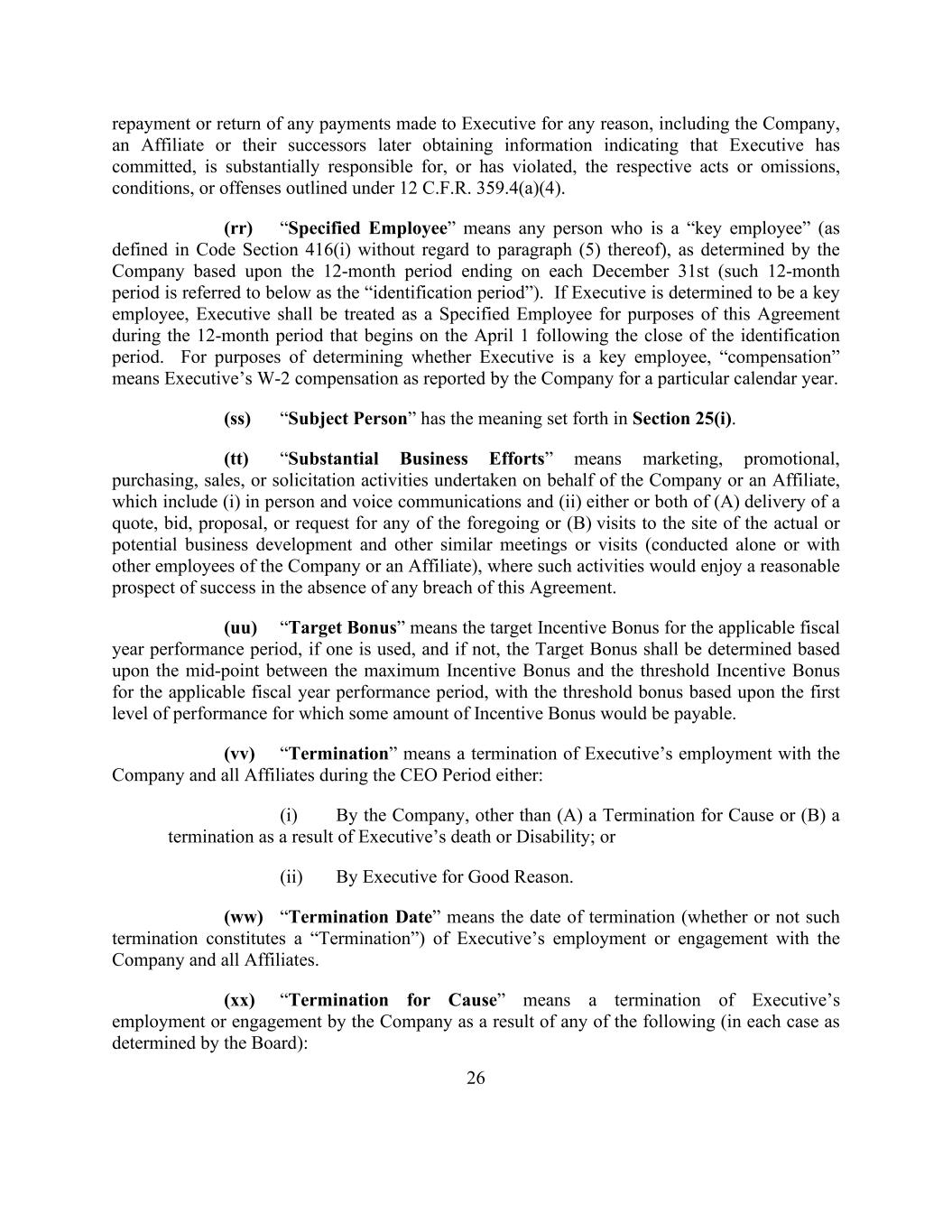 26 repayment or return of any payments made to Executive for any reason, including the Company, an Affiliate or their successors later obtaining information indicating that Executive has committed, is substantially responsible for, or has violated, the respective acts or omissions, conditions, or offenses outlined under 12 C.F.R. 359.4(a)(4). (rr) “Specified Employee” means any person who is a “key employee” (as defined in Code Section 416(i) without regard to paragraph (5) thereof), as determined by the Company based upon the 12-month period ending on each December 31st (such 12-month period is referred to below as the “identification period”). If Executive is determined to be a key employee, Executive shall be treated as a Specified Employee for purposes of this Agreement during the 12-month period that begins on the April 1 following the close of the identification period. For purposes of determining whether Executive is a key employee, “compensation” means Executive’s W-2 compensation as reported by the Company for a particular calendar year. (ss) “Subject Person” has the meaning set forth in Section 25(i). (tt) “Substantial Business Efforts” means marketing, promotional, purchasing, sales, or solicitation activities undertaken on behalf of the Company or an Affiliate, which include (i) in person and voice communications and (ii) either or both of (A) delivery of a quote, bid, proposal, or request for any of the foregoing or (B) visits to the site of the actual or potential business development and other similar meetings or visits (conducted alone or with other employees of the Company or an Affiliate), where such activities would enjoy a reasonable prospect of success in the absence of any breach of this Agreement. (uu) “Target Bonus” means the target Incentive Bonus for the applicable fiscal year performance period, if one is used, and if not, the Target Bonus shall be determined based upon the mid-point between the maximum Incentive Bonus and the threshold Incentive Bonus for the applicable fiscal year performance period, with the threshold bonus based upon the first level of performance for which some amount of Incentive Bonus would be payable. (vv) “Termination” means a termination of Executive’s employment with the Company and all Affiliates during the CEO Period either: (i) By the Company, other than (A) a Termination for Cause or (B) a termination as a result of Executive’s death or Disability; or (ii) By Executive for Good Reason. (ww) “Termination Date” means the date of termination (whether or not such termination constitutes a “Termination”) of Executive’s employment or engagement with the Company and all Affiliates. (xx) “Termination for Cause” means a termination of Executive’s employment or engagement by the Company as a result of any of the following (in each case as determined by the Board):