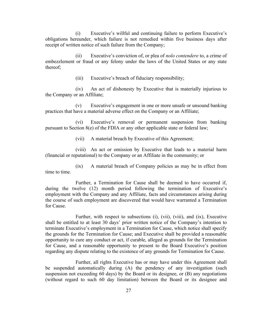 27 (i) Executive’s willful and continuing failure to perform Executive’s obligations hereunder, which failure is not remedied within five business days after receipt of written notice of such failure from the Company; (ii) Executive’s conviction of, or plea of nolo contendere to, a crime of embezzlement or fraud or any felony under the laws of the United States or any state thereof; (iii) Executive’s breach of fiduciary responsibility; (iv) An act of dishonesty by Executive that is materially injurious to the Company or an Affiliate; (v) Executive’s engagement in one or more unsafe or unsound banking practices that have a material adverse effect on the Company or an Affiliate; (vi) Executive’s removal or permanent suspension from banking pursuant to Section 8(e) of the FDIA or any other applicable state or federal law; (vii) A material breach by Executive of this Agreement; (viii) An act or omission by Executive that leads to a material harm (financial or reputational) to the Company or an Affiliate in the community; or (ix) A material breach of Company policies as may be in effect from time to time. Further, a Termination for Cause shall be deemed to have occurred if, during the twelve (12) month period following the termination of Executive’s employment with the Company and any Affiliate, facts and circumstances arising during the course of such employment are discovered that would have warranted a Termination for Cause. Further, with respect to subsections (i), (vii), (viii), and (ix), Executive shall be entitled to at least 30 days’ prior written notice of the Company’s intention to terminate Executive’s employment in a Termination for Cause, which notice shall specify the grounds for the Termination for Cause; and Executive shall be provided a reasonable opportunity to cure any conduct or act, if curable, alleged as grounds for the Termination for Cause, and a reasonable opportunity to present to the Board Executive’s position regarding any dispute relating to the existence of any grounds for Termination for Cause. Further, all rights Executive has or may have under this Agreement shall be suspended automatically during (A) the pendency of any investigation (such suspension not exceeding 60 days) by the Board or its designee, or (B) any negotiations (without regard to such 60 day limitation) between the Board or its designee and
