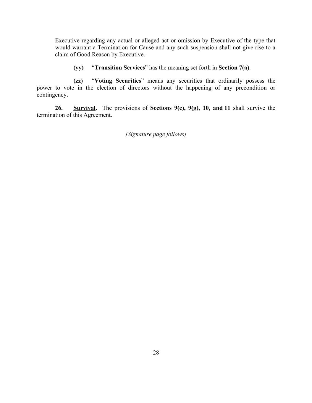 28 Executive regarding any actual or alleged act or omission by Executive of the type that would warrant a Termination for Cause and any such suspension shall not give rise to a claim of Good Reason by Executive. (yy) “Transition Services” has the meaning set forth in Section 7(a). (zz) “Voting Securities” means any securities that ordinarily possess the power to vote in the election of directors without the happening of any precondition or contingency. 26. Survival. The provisions of Sections 9(e), 9(g), 10, and 11 shall survive the termination of this Agreement. [Signature page follows]