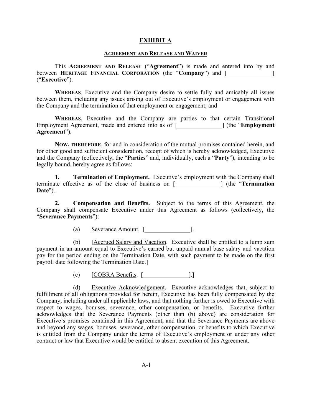 A-1 EXHIBIT A AGREEMENT AND RELEASE AND WAIVER This AGREEMENT AND RELEASE (“Agreement”) is made and entered into by and between HERITAGE FINANCIAL CORPORATION (the “Company”) and [_______________] (“Executive”). WHEREAS, Executive and the Company desire to settle fully and amicably all issues between them, including any issues arising out of Executive’s employment or engagement with the Company and the termination of that employment or engagement; and WHEREAS, Executive and the Company are parties to that certain Transitional Employment Agreement, made and entered into as of [_______________] (the “Employment Agreement”). NOW, THEREFORE, for and in consideration of the mutual promises contained herein, and for other good and sufficient consideration, receipt of which is hereby acknowledged, Executive and the Company (collectively, the “Parties” and, individually, each a “Party”), intending to be legally bound, hereby agree as follows: 1. Termination of Employment. Executive’s employment with the Company shall terminate effective as of the close of business on [_______________] (the “Termination Date”). 2. Compensation and Benefits. Subject to the terms of this Agreement, the Company shall compensate Executive under this Agreement as follows (collectively, the “Severance Payments”): (a) Severance Amount. [_______________]. (b) [Accrued Salary and Vacation. Executive shall be entitled to a lump sum payment in an amount equal to Executive’s earned but unpaid annual base salary and vacation pay for the period ending on the Termination Date, with such payment to be made on the first payroll date following the Termination Date.] (c) [COBRA Benefits. [_______________].] (d) Executive Acknowledgement. Executive acknowledges that, subject to fulfillment of all obligations provided for herein, Executive has been fully compensated by the Company, including under all applicable laws, and that nothing further is owed to Executive with respect to wages, bonuses, severance, other compensation, or benefits. Executive further acknowledges that the Severance Payments (other than (b) above) are consideration for Executive’s promises contained in this Agreement, and that the Severance Payments are above and beyond any wages, bonuses, severance, other compensation, or benefits to which Executive is entitled from the Company under the terms of Executive’s employment or under any other contract or law that Executive would be entitled to absent execution of this Agreement.