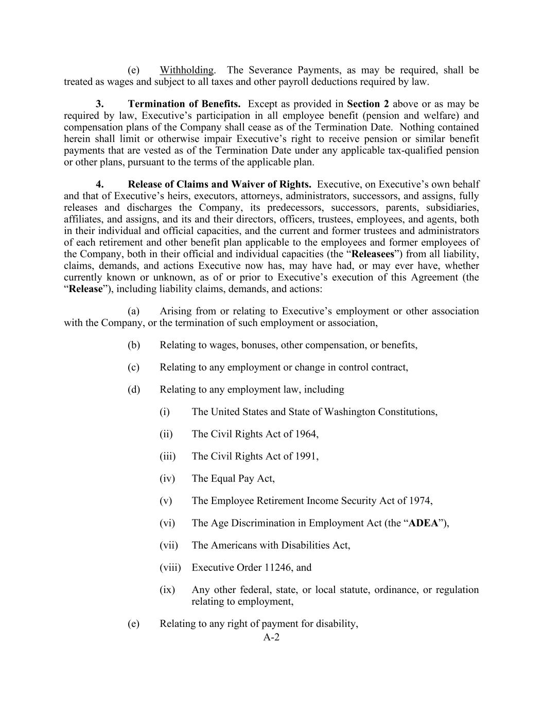 A-2 (e) Withholding. The Severance Payments, as may be required, shall be treated as wages and subject to all taxes and other payroll deductions required by law. 3. Termination of Benefits. Except as provided in Section 2 above or as may be required by law, Executive’s participation in all employee benefit (pension and welfare) and compensation plans of the Company shall cease as of the Termination Date. Nothing contained herein shall limit or otherwise impair Executive’s right to receive pension or similar benefit payments that are vested as of the Termination Date under any applicable tax-qualified pension or other plans, pursuant to the terms of the applicable plan. 4. Release of Claims and Waiver of Rights. Executive, on Executive’s own behalf and that of Executive’s heirs, executors, attorneys, administrators, successors, and assigns, fully releases and discharges the Company, its predecessors, successors, parents, subsidiaries, affiliates, and assigns, and its and their directors, officers, trustees, employees, and agents, both in their individual and official capacities, and the current and former trustees and administrators of each retirement and other benefit plan applicable to the employees and former employees of the Company, both in their official and individual capacities (the “Releasees”) from all liability, claims, demands, and actions Executive now has, may have had, or may ever have, whether currently known or unknown, as of or prior to Executive’s execution of this Agreement (the “Release”), including liability claims, demands, and actions: (a) Arising from or relating to Executive’s employment or other association with the Company, or the termination of such employment or association, (b) Relating to wages, bonuses, other compensation, or benefits, (c) Relating to any employment or change in control contract, (d) Relating to any employment law, including (i) The United States and State of Washington Constitutions, (ii) The Civil Rights Act of 1964, (iii) The Civil Rights Act of 1991, (iv) The Equal Pay Act, (v) The Employee Retirement Income Security Act of 1974, (vi) The Age Discrimination in Employment Act (the “ADEA”), (vii) The Americans with Disabilities Act, (viii) Executive Order 11246, and (ix) Any other federal, state, or local statute, ordinance, or regulation relating to employment, (e) Relating to any right of payment for disability,