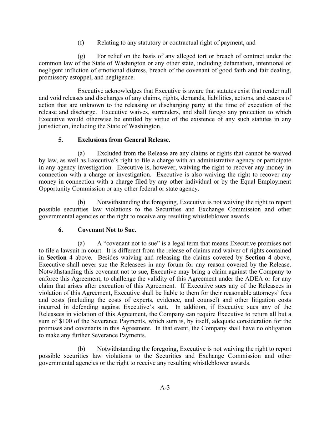 A-3 (f) Relating to any statutory or contractual right of payment, and (g) For relief on the basis of any alleged tort or breach of contract under the common law of the State of Washington or any other state, including defamation, intentional or negligent infliction of emotional distress, breach of the covenant of good faith and fair dealing, promissory estoppel, and negligence. Executive acknowledges that Executive is aware that statutes exist that render null and void releases and discharges of any claims, rights, demands, liabilities, actions, and causes of action that are unknown to the releasing or discharging party at the time of execution of the release and discharge. Executive waives, surrenders, and shall forego any protection to which Executive would otherwise be entitled by virtue of the existence of any such statutes in any jurisdiction, including the State of Washington. 5. Exclusions from General Release. (a) Excluded from the Release are any claims or rights that cannot be waived by law, as well as Executive’s right to file a charge with an administrative agency or participate in any agency investigation. Executive is, however, waiving the right to recover any money in connection with a charge or investigation. Executive is also waiving the right to recover any money in connection with a charge filed by any other individual or by the Equal Employment Opportunity Commission or any other federal or state agency. (b) Notwithstanding the foregoing, Executive is not waiving the right to report possible securities law violations to the Securities and Exchange Commission and other governmental agencies or the right to receive any resulting whistleblower awards. 6. Covenant Not to Sue. (a) A “covenant not to sue” is a legal term that means Executive promises not to file a lawsuit in court. It is different from the release of claims and waiver of rights contained in Section 4 above. Besides waiving and releasing the claims covered by Section 4 above, Executive shall never sue the Releasees in any forum for any reason covered by the Release. Notwithstanding this covenant not to sue, Executive may bring a claim against the Company to enforce this Agreement, to challenge the validity of this Agreement under the ADEA or for any claim that arises after execution of this Agreement. If Executive sues any of the Releasees in violation of this Agreement, Executive shall be liable to them for their reasonable attorneys’ fees and costs (including the costs of experts, evidence, and counsel) and other litigation costs incurred in defending against Executive’s suit. In addition, if Executive sues any of the Releasees in violation of this Agreement, the Company can require Executive to return all but a sum of $100 of the Severance Payments, which sum is, by itself, adequate consideration for the promises and covenants in this Agreement. In that event, the Company shall have no obligation to make any further Severance Payments. (b) Notwithstanding the foregoing, Executive is not waiving the right to report possible securities law violations to the Securities and Exchange Commission and other governmental agencies or the right to receive any resulting whistleblower awards.