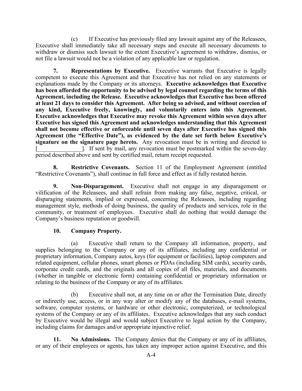 A-4 (c) If Executive has previously filed any lawsuit against any of the Releasees, Executive shall immediately take all necessary steps and execute all necessary documents to withdraw or dismiss such lawsuit to the extent Executive’s agreement to withdraw, dismiss, or not file a lawsuit would not be a violation of any applicable law or regulation. 7. Representations by Executive. Executive warrants that Executive is legally competent to execute this Agreement and that Executive has not relied on any statements or explanations made by the Company or its attorneys. Executive acknowledges that Executive has been afforded the opportunity to be advised by legal counsel regarding the terms of this Agreement, including the Release. Executive acknowledges that Executive has been offered at least 21 days to consider this Agreement. After being so advised, and without coercion of any kind, Executive freely, knowingly, and voluntarily enters into this Agreement. Executive acknowledges that Executive may revoke this Agreement within seven days after Executive has signed this Agreement and acknowledges understanding that this Agreement shall not become effective or enforceable until seven days after Executive has signed this Agreement (the “Effective Date”), as evidenced by the date set forth below Executive’s signature on the signature page hereto. Any revocation must be in writing and directed to [_______________]. If sent by mail, any revocation must be postmarked within the seven-day period described above and sent by certified mail, return receipt requested. 8. Restrictive Covenants. Section 11 of the Employment Agreement (entitled “Restrictive Covenants”), shall continue in full force and effect as if fully restated herein. 9. Non-Disparagement. Executive shall not engage in any disparagement or vilification of the Releasees, and shall refrain from making any false, negative, critical, or disparaging statements, implied or expressed, concerning the Releasees, including regarding management style, methods of doing business, the quality of products and services, role in the community, or treatment of employees. Executive shall do nothing that would damage the Company’s business reputation or goodwill. 10. Company Property. (a) Executive shall return to the Company all information, property, and supplies belonging to the Company or any of its affiliates, including any confidential or proprietary information, Company autos, keys (for equipment or facilities), laptop computers and related equipment, cellular phones, smart phones or PDAs (including SIM cards), security cards, corporate credit cards, and the originals and all copies of all files, materials, and documents (whether in tangible or electronic form) containing confidential or proprietary information or relating to the business of the Company or any of its affiliates. (b) Executive shall not, at any time on or after the Termination Date, directly or indirectly use, access, or in any way alter or modify any of the databases, e-mail systems, software, computer systems, or hardware or other electronic, computerized, or technological systems of the Company or any of its affiliates. Executive acknowledges that any such conduct by Executive would be illegal and would subject Executive to legal action by the Company, including claims for damages and/or appropriate injunctive relief. 11. No Admissions. The Company denies that the Company or any of its affiliates, or any of their employees or agents, has taken any improper action against Executive, and this