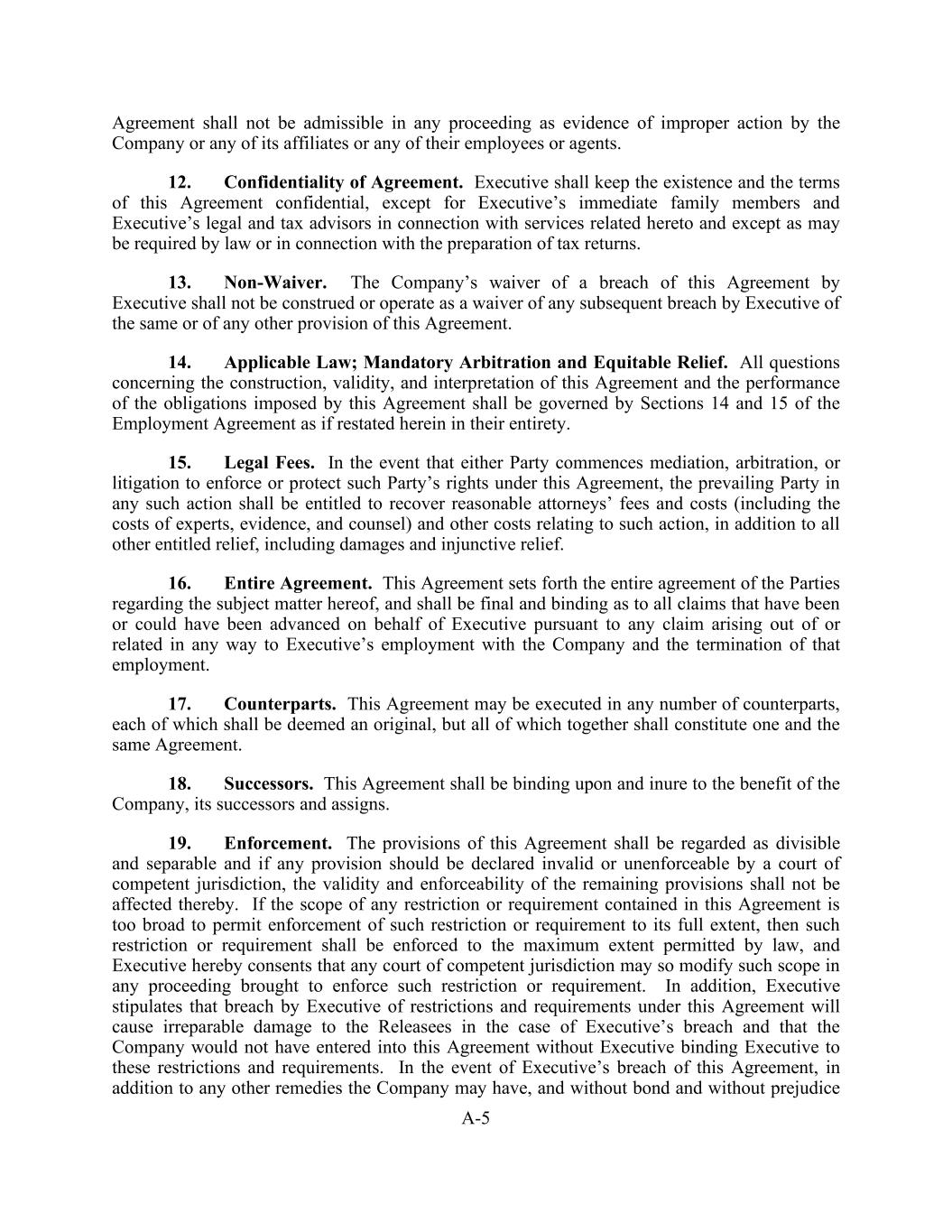 A-5 Agreement shall not be admissible in any proceeding as evidence of improper action by the Company or any of its affiliates or any of their employees or agents. 12. Confidentiality of Agreement. Executive shall keep the existence and the terms of this Agreement confidential, except for Executive’s immediate family members and Executive’s legal and tax advisors in connection with services related hereto and except as may be required by law or in connection with the preparation of tax returns. 13. Non-Waiver. The Company’s waiver of a breach of this Agreement by Executive shall not be construed or operate as a waiver of any subsequent breach by Executive of the same or of any other provision of this Agreement. 14. Applicable Law; Mandatory Arbitration and Equitable Relief. All questions concerning the construction, validity, and interpretation of this Agreement and the performance of the obligations imposed by this Agreement shall be governed by Sections 14 and 15 of the Employment Agreement as if restated herein in their entirety. 15. Legal Fees. In the event that either Party commences mediation, arbitration, or litigation to enforce or protect such Party’s rights under this Agreement, the prevailing Party in any such action shall be entitled to recover reasonable attorneys’ fees and costs (including the costs of experts, evidence, and counsel) and other costs relating to such action, in addition to all other entitled relief, including damages and injunctive relief. 16. Entire Agreement. This Agreement sets forth the entire agreement of the Parties regarding the subject matter hereof, and shall be final and binding as to all claims that have been or could have been advanced on behalf of Executive pursuant to any claim arising out of or related in any way to Executive’s employment with the Company and the termination of that employment. 17. Counterparts. This Agreement may be executed in any number of counterparts, each of which shall be deemed an original, but all of which together shall constitute one and the same Agreement. 18. Successors. This Agreement shall be binding upon and inure to the benefit of the Company, its successors and assigns. 19. Enforcement. The provisions of this Agreement shall be regarded as divisible and separable and if any provision should be declared invalid or unenforceable by a court of competent jurisdiction, the validity and enforceability of the remaining provisions shall not be affected thereby. If the scope of any restriction or requirement contained in this Agreement is too broad to permit enforcement of such restriction or requirement to its full extent, then such restriction or requirement shall be enforced to the maximum extent permitted by law, and Executive hereby consents that any court of competent jurisdiction may so modify such scope in any proceeding brought to enforce such restriction or requirement. In addition, Executive stipulates that breach by Executive of restrictions and requirements under this Agreement will cause irreparable damage to the Releasees in the case of Executive’s breach and that the Company would not have entered into this Agreement without Executive binding Executive to these restrictions and requirements. In the event of Executive’s breach of this Agreement, in addition to any other remedies the Company may have, and without bond and without prejudice