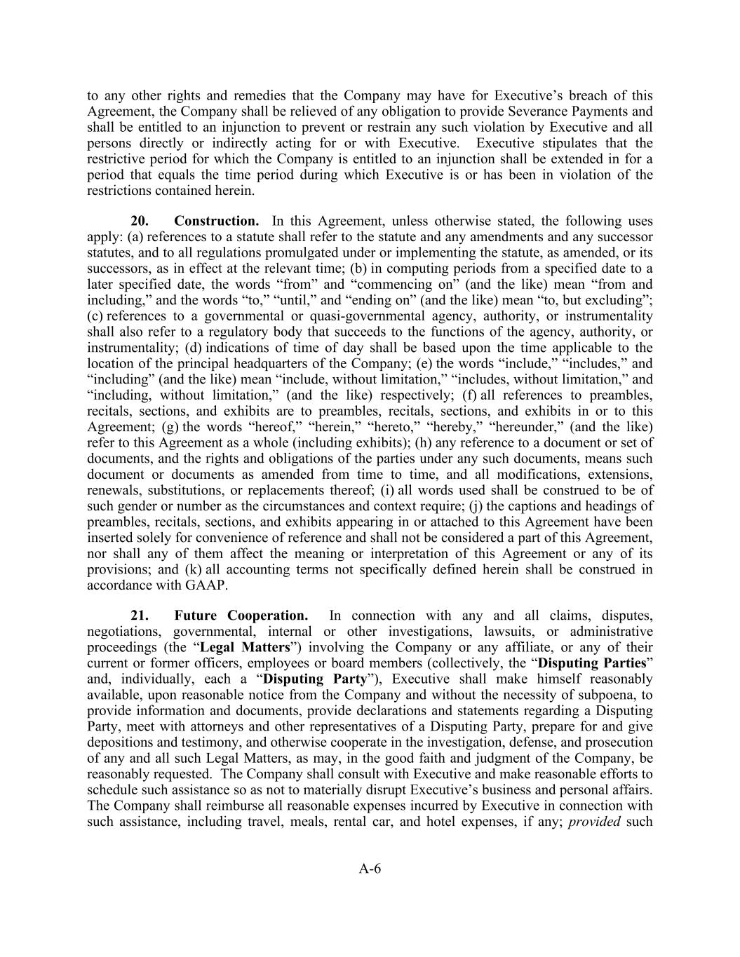 A-6 to any other rights and remedies that the Company may have for Executive’s breach of this Agreement, the Company shall be relieved of any obligation to provide Severance Payments and shall be entitled to an injunction to prevent or restrain any such violation by Executive and all persons directly or indirectly acting for or with Executive. Executive stipulates that the restrictive period for which the Company is entitled to an injunction shall be extended in for a period that equals the time period during which Executive is or has been in violation of the restrictions contained herein. 20. Construction. In this Agreement, unless otherwise stated, the following uses apply: (a) references to a statute shall refer to the statute and any amendments and any successor statutes, and to all regulations promulgated under or implementing the statute, as amended, or its successors, as in effect at the relevant time; (b) in computing periods from a specified date to a later specified date, the words “from” and “commencing on” (and the like) mean “from and including,” and the words “to,” “until,” and “ending on” (and the like) mean “to, but excluding”; (c) references to a governmental or quasi-governmental agency, authority, or instrumentality shall also refer to a regulatory body that succeeds to the functions of the agency, authority, or instrumentality; (d) indications of time of day shall be based upon the time applicable to the location of the principal headquarters of the Company; (e) the words “include,” “includes,” and “including” (and the like) mean “include, without limitation,” “includes, without limitation,” and “including, without limitation,” (and the like) respectively; (f) all references to preambles, recitals, sections, and exhibits are to preambles, recitals, sections, and exhibits in or to this Agreement; (g) the words “hereof,” “herein,” “hereto,” “hereby,” “hereunder,” (and the like) refer to this Agreement as a whole (including exhibits); (h) any reference to a document or set of documents, and the rights and obligations of the parties under any such documents, means such document or documents as amended from time to time, and all modifications, extensions, renewals, substitutions, or replacements thereof; (i) all words used shall be construed to be of such gender or number as the circumstances and context require; (j) the captions and headings of preambles, recitals, sections, and exhibits appearing in or attached to this Agreement have been inserted solely for convenience of reference and shall not be considered a part of this Agreement, nor shall any of them affect the meaning or interpretation of this Agreement or any of its provisions; and (k) all accounting terms not specifically defined herein shall be construed in accordance with GAAP. 21. Future Cooperation. In connection with any and all claims, disputes, negotiations, governmental, internal or other investigations, lawsuits, or administrative proceedings (the “Legal Matters”) involving the Company or any affiliate, or any of their current or former officers, employees or board members (collectively, the “Disputing Parties” and, individually, each a “Disputing Party”), Executive shall make himself reasonably available, upon reasonable notice from the Company and without the necessity of subpoena, to provide information and documents, provide declarations and statements regarding a Disputing Party, meet with attorneys and other representatives of a Disputing Party, prepare for and give depositions and testimony, and otherwise cooperate in the investigation, defense, and prosecution of any and all such Legal Matters, as may, in the good faith and judgment of the Company, be reasonably requested. The Company shall consult with Executive and make reasonable efforts to schedule such assistance so as not to materially disrupt Executive’s business and personal affairs. The Company shall reimburse all reasonable expenses incurred by Executive in connection with such assistance, including travel, meals, rental car, and hotel expenses, if any; provided such
