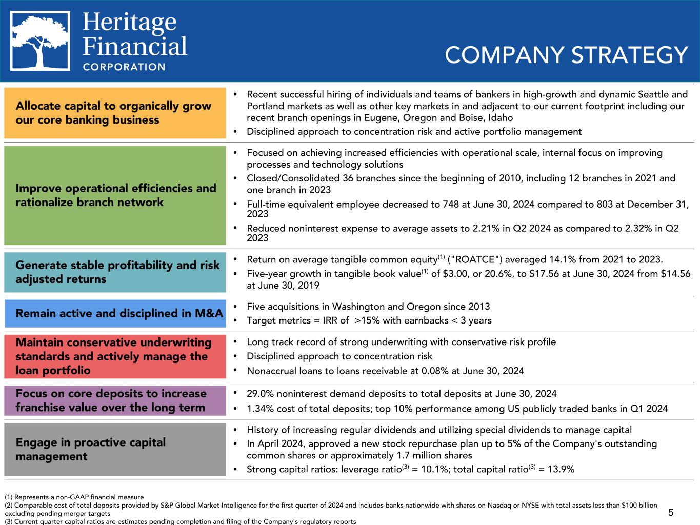 4 OVERVIEW General Overview Nasdaq symbol HFWA Stock price(2) $20.82 Market capitalization(2) $722 million Institutional ownership(2) 82.4% Headquarters Olympia, WA # of branches 50 Year established 1927 Q2 2024 Financial Highlights Assets $7.1 billion Deposits $5.5 billion Loans receivable $4.5 billion Net income $14.2 million Net interest margin 3.29% ROAE(3) 6.75% ROATCE(1)(4) 9.74% Adjusted ROATCE(1)(4) 10.76% Efficiency ratio 69.4% Adjusted efficiency ratio(1) 67.1% Leverage ratio 10.1% Total capital ratio 13.9% Map obtained from S&P Global Market Intelligence; certain locations of branches overlap on the map. (1) Represents a non-GAAP financial measure (2) Market information as of July 16, 2024. (3) Return on average equity (4) Return on average tangible common equity Metropolitan Statistical Areas Seattle-Tacoma-Bellevue, WA Portland-Vancouver-Hillsboro, OR-WA Eugene-Springfield, OR Boise–Nampa, ID Heritage Branch
