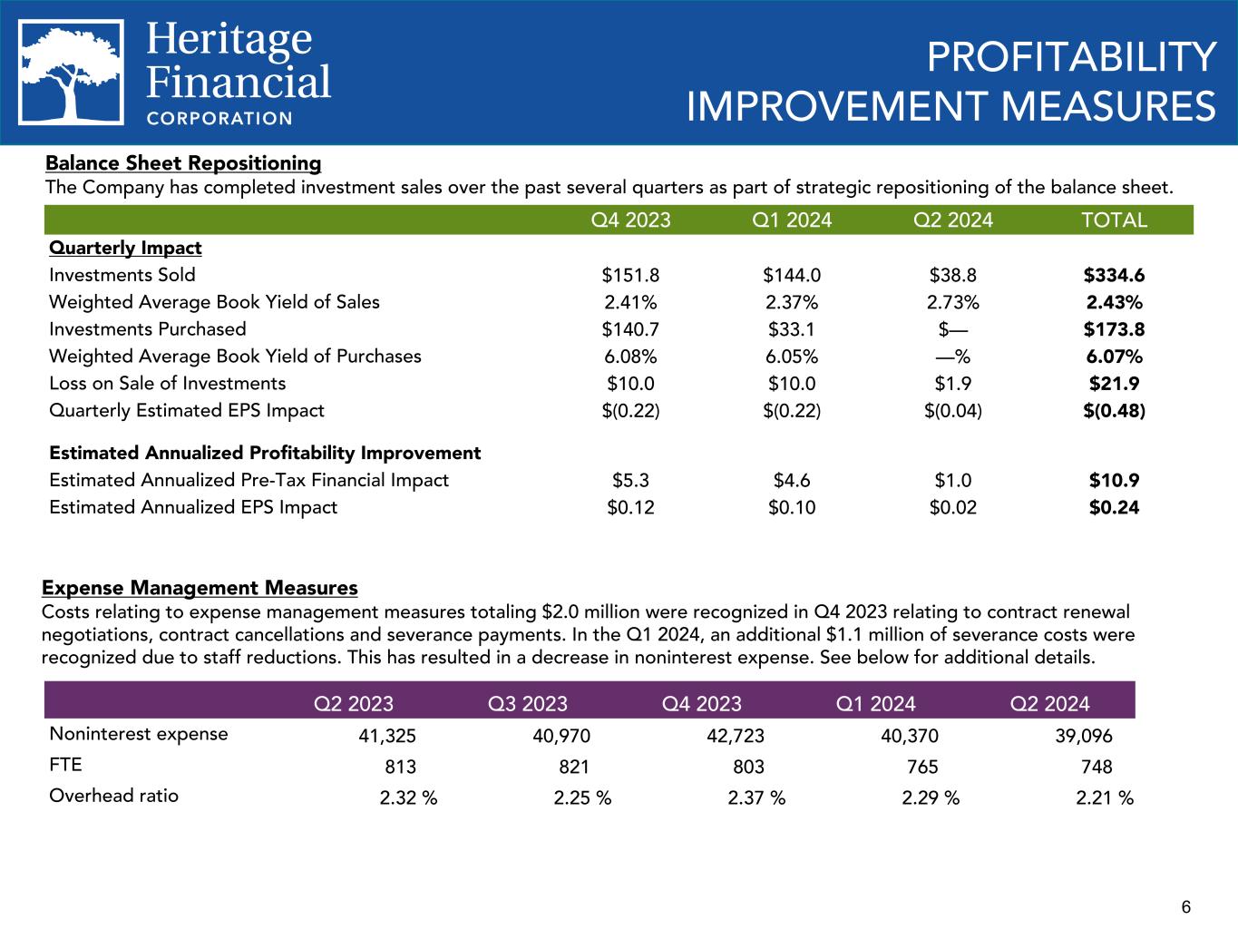 6 PROFITABILITY IMPROVEMENT MEASURES Q4 2023 Q1 2024 Q2 2024 TOTAL Quarterly Impact Investments Sold $151.8 $144.0 $38.8 $334.6 Weighted Average Book Yield of Sales 2.41% 2.37% 2.73% 2.43% Investments Purchased $140.7 $33.1 $— $173.8 Weighted Average Book Yield of Purchases 6.08% 6.05% —% 6.07% Loss on Sale of Investments $10.0 $10.0 $1.9 $21.9 Quarterly Estimated EPS Impact $(0.22) $(0.22) $(0.04) $(0.48) Estimated Annualized Profitability Improvement Estimated Annualized Pre-Tax Financial Impact $5.3 $4.6 $1.0 $10.9 Estimated Annualized EPS Impact $0.12 $0.10 $0.02 $0.24 Balance Sheet Repositioning The Company has completed investment sales over the past several quarters as part of strategic repositioning of the balance sheet. Q2 2023 Q3 2023 Q4 2023 Q1 2024 Q2 2024 Noninterest expense 41,325 40,970 42,723 40,370 39,096 FTE 813 821 803 765 748 Overhead ratio 2.32 % 2.25 % 2.37 % 2.29 % 2.21 % Expense Management Measures Costs relating to expense management measures totaling $2.0 million were recognized in Q4 2023 relating to contract renewal negotiations, contract cancellations and severance payments. In the Q1 2024, an additional $1.1 million of severance costs were recognized due to staff reductions. This has resulted in a decrease in noninterest expense. See below for additional details. 41,325 40,970 42,723 40,370 39,096 2.32% 2.25% 2.37% 2.29% 2.21% Overhead ratio Noninterest expense Q2 2023 Q3 2023 Q4 2023 Q1 2024 Q2 2024