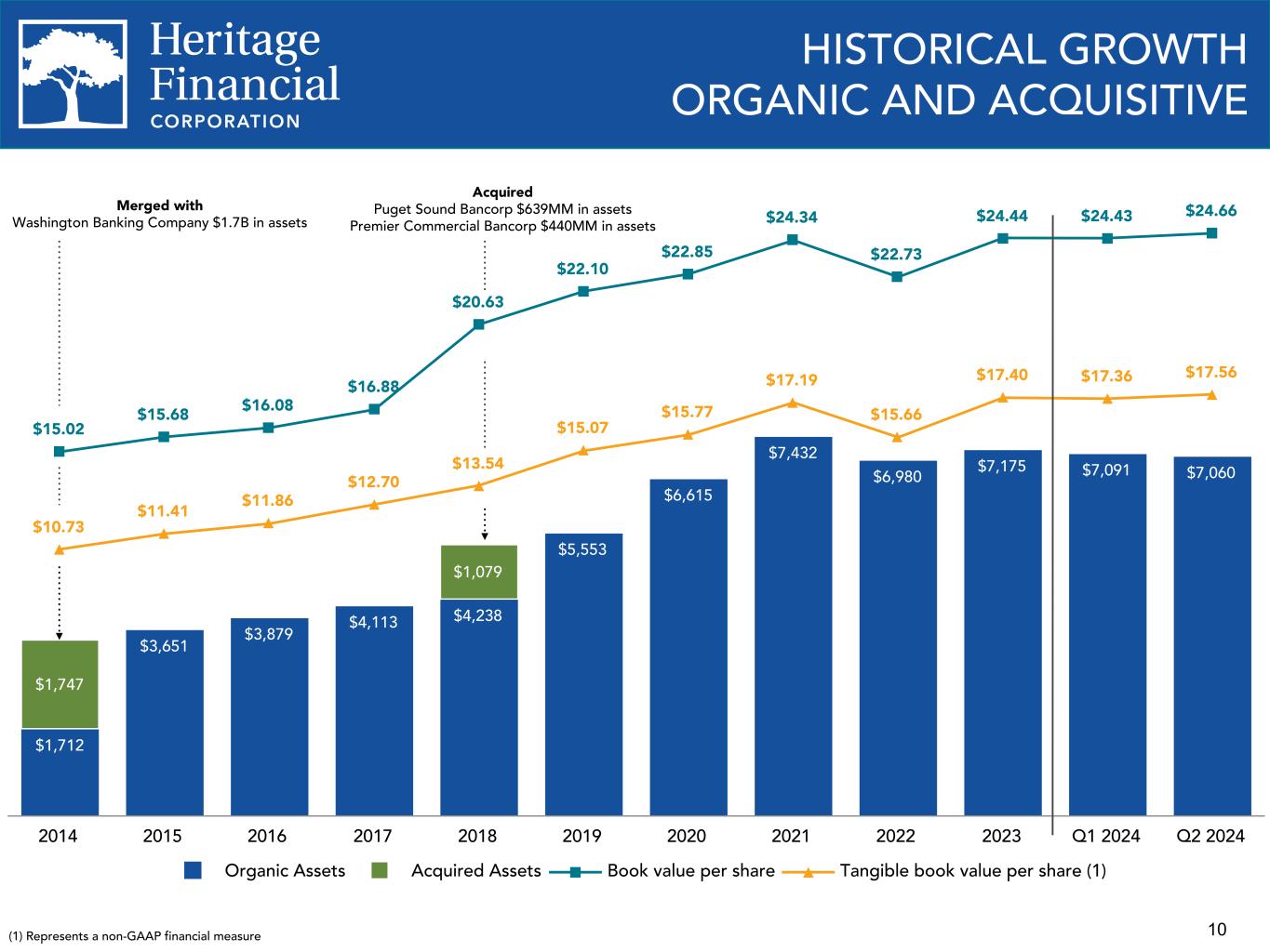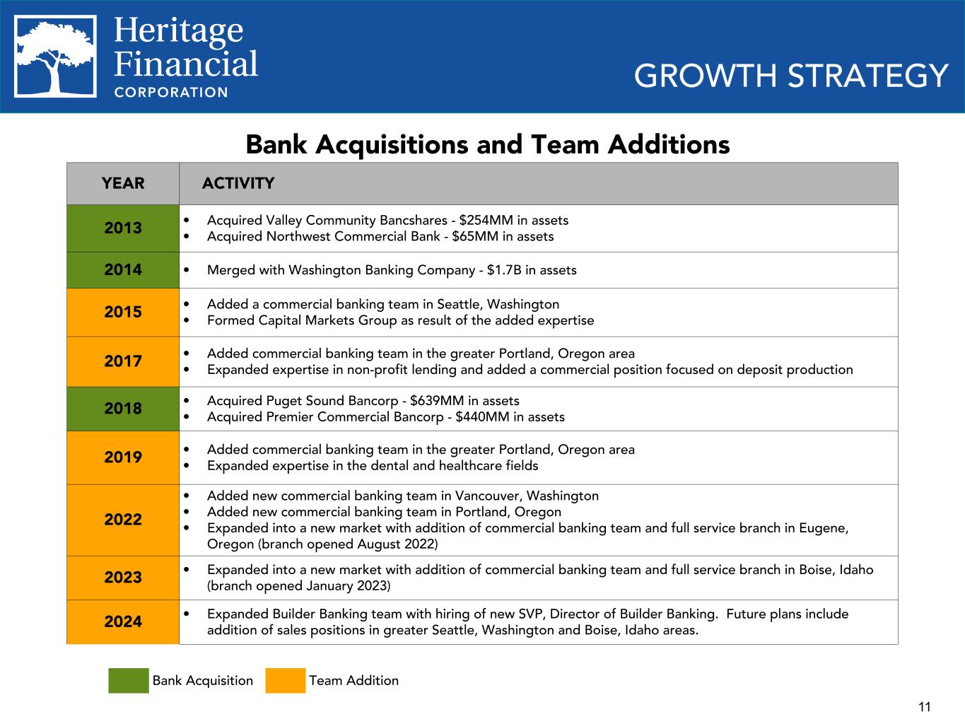 10 $1,712 $3,651 $3,879 $4,113 $4,238 $5,553 $6,615 $7,432 $6,980 $7,175 $7,091 $7,060 $1,747 $1,079 $15.02 $15.68 $16.08 $16.88 $20.63 $22.10 $22.85 $24.34 $22.73 $24.44 $24.43 $24.66 $10.73 $11.41 $11.86 $12.70 $13.54 $15.07 $15.77 $17.19 $15.66 $17.40 $17.36 $17.56 Organic Assets Acquired Assets Book value per share Tangible book value per share (1) 2014 2015 2016 2017 2018 2019 2020 2021 2022 2023 Q1 2024 Q2 2024 Acquired Puget Sound Bancorp $639MM in assets Premier Commercial Bancorp $440MM in assets HISTORICAL GROWTH ORGANIC AND ACQUISITIVE Merged with Washington Banking Company $1.7B in assets (1) Represents a non-GAAP financial measure