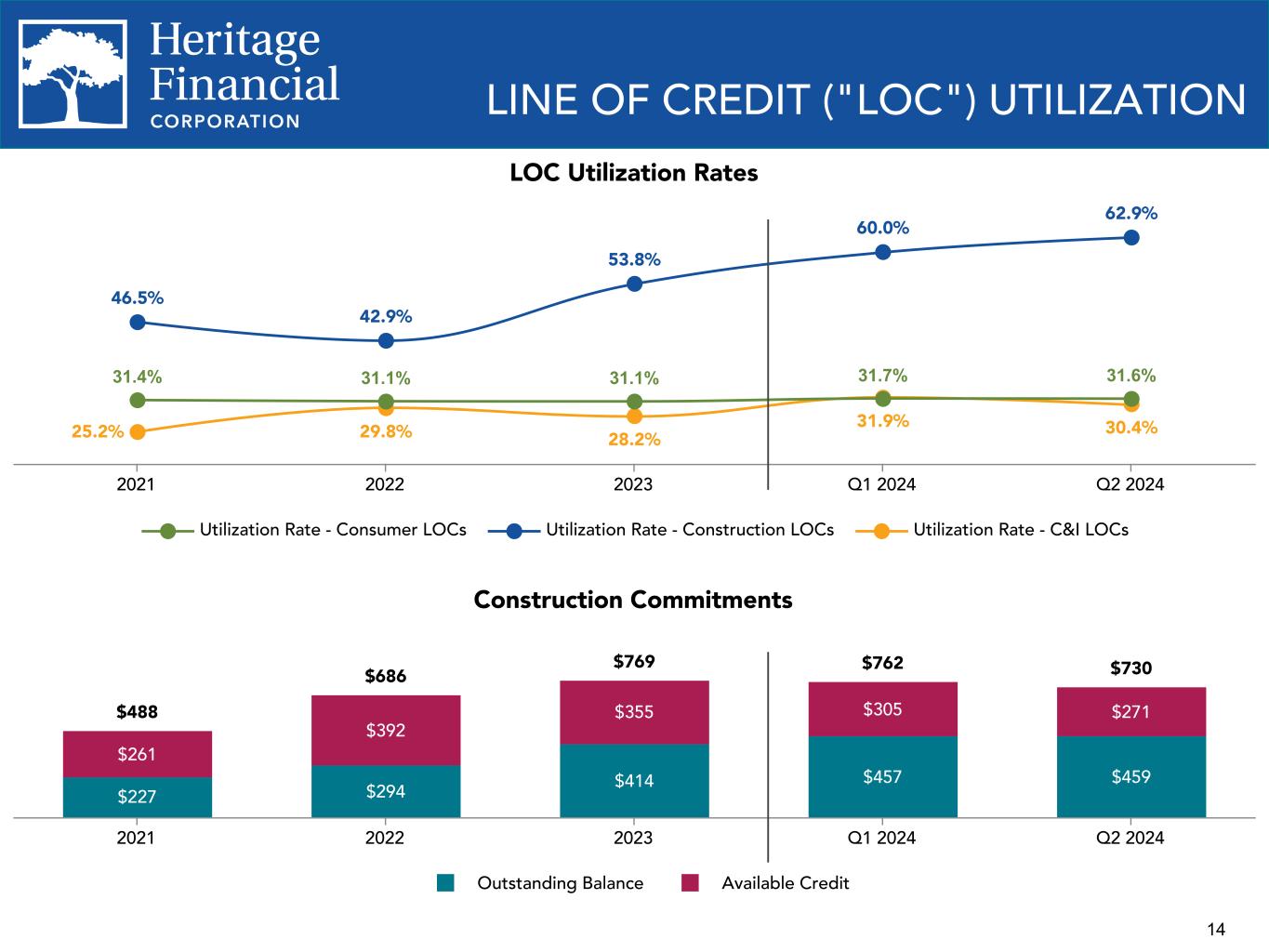 13 LOAN PORTFOLIO Loan Portfolio Composition $232 $196 $171 $171 $167$165 $344 $375 $386 $413 $227 $294 $414 $457 $459 $768 $693 $718 $760 $779 $2,424 $2,524 $2,657 $2,655 $2,714 Consumer Residential real estate Construction & land development Commercial and Industrial (C&I) Commercial real estate (CRE) 2021 2022 2023 Q1 2024 Q2 2024 New Loan Commitments $23 $17 $18 $20 $25$27 $11 $3 $14 $27 $81 $91 $57 $39 $63 $58 $42 $81 $60 $87 $73 $84 $49 $34 $68 Consumer Residential real estate Construction & land development Commercial and Industrial (C&I) Commercial Real Estate (CRE) Q2 2023 Q3 2023 Q4 2023 Q1 2024 Q2 2024