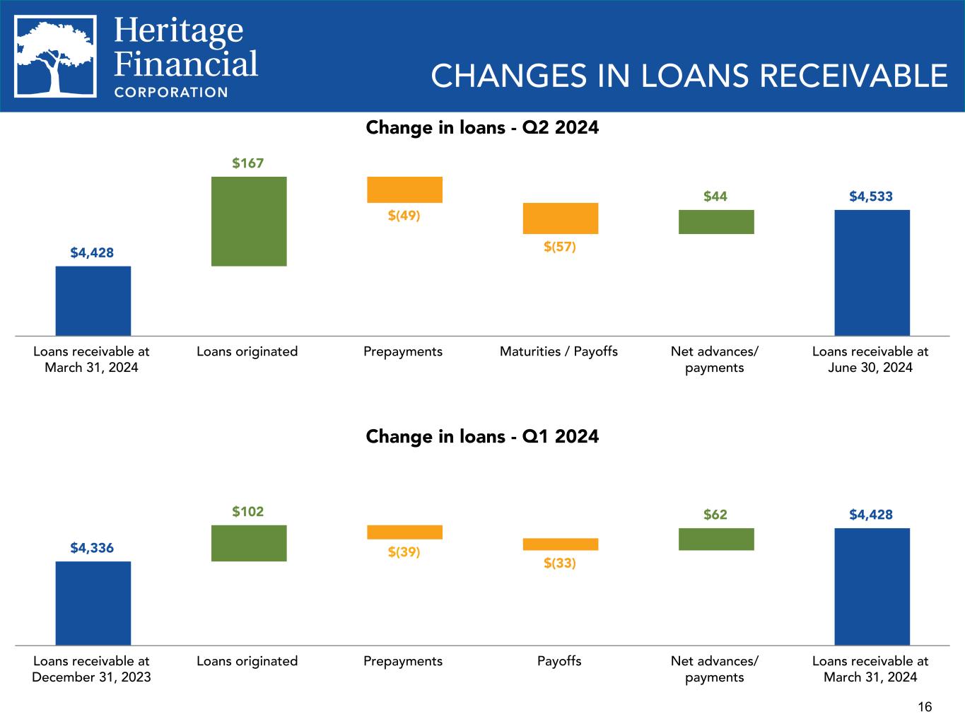 16 CHANGES IN LOANS RECEIVABLE $4,428 $167 $(49) $(57) $44 $4,533 Loans receivable at March 31, 2024 Loans originated Prepayments Maturities / Payoffs Net advances/ payments Loans receivable at June 30, 2024 $4,336 $102 $(39) $(33) $62 $4,428 Loans receivable at December 31, 2023 Loans originated Prepayments Payoffs Net advances/ payments Loans receivable at March 31, 2024 Change in loans - Q2 2024 Change in loans - Q1 2024