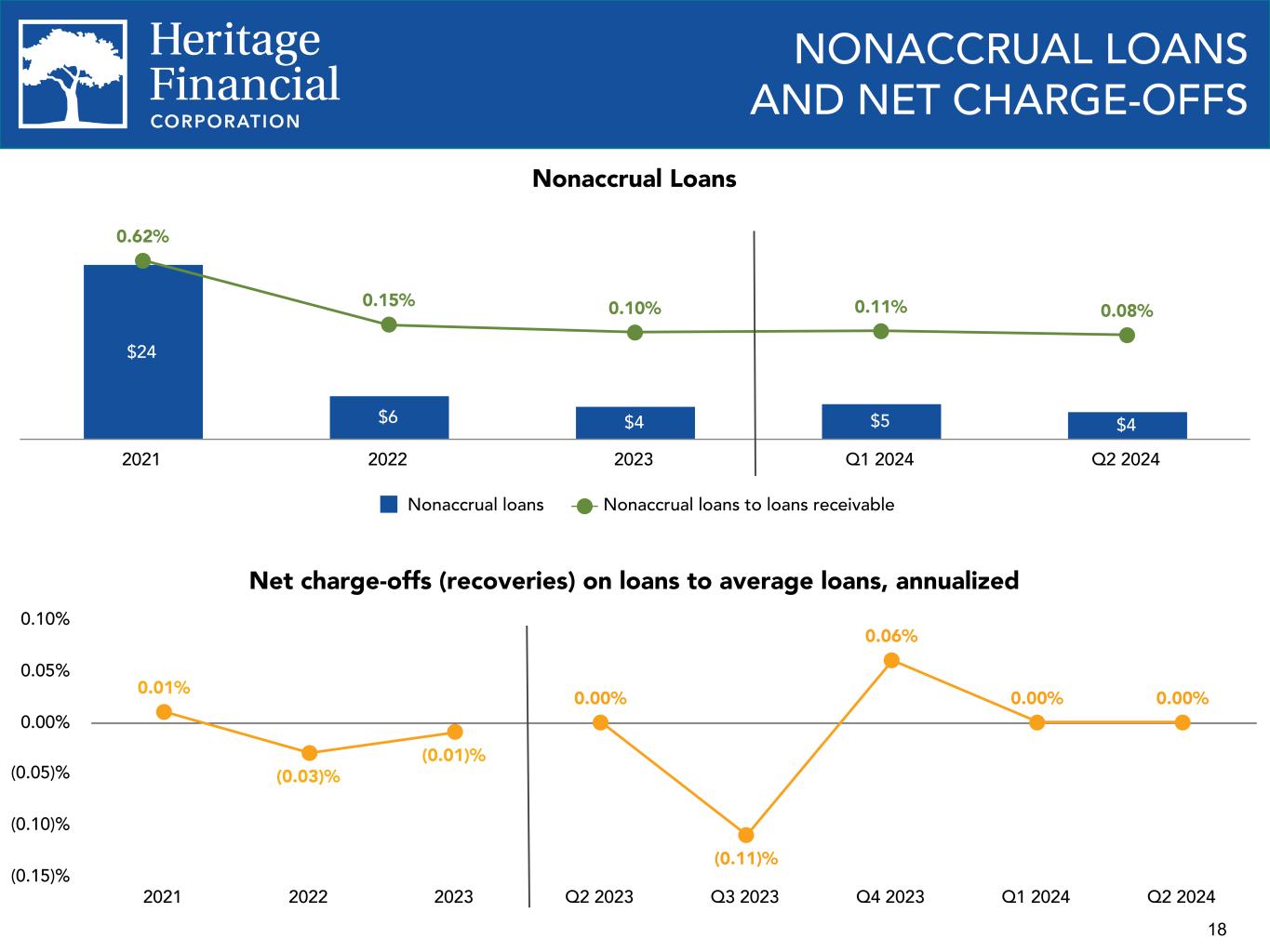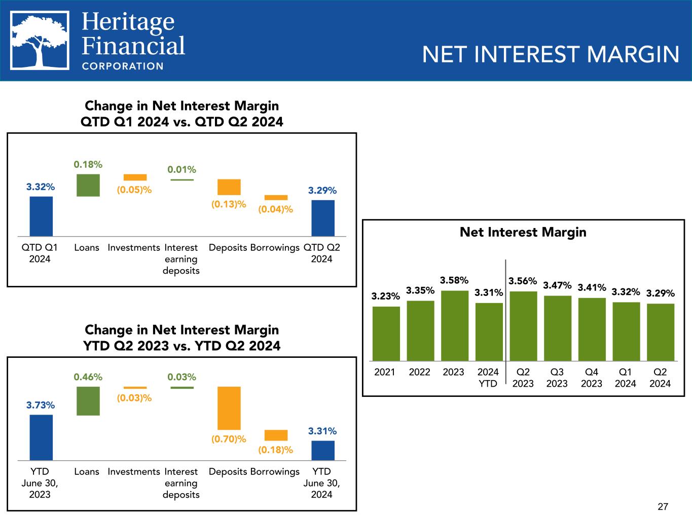 2 This presentation contains “forward-looking statements” within the meaning of the Private Securities Litigation Reform Act of 1995. Forward-looking statements are not statements of historical fact, are based on certain assumptions and often include the words “believes,” “expects,” “anticipates,” “estimates,” “forecasts,” “intends,” “plans,” “targets,” “potentially,” “probably,” “projects,” “outlook” or similar expressions or future or conditional verbs such as “may,” “will,” “should,” “would” and “could,” as well as negative of such words. These statements relate to Heritage Financial Corporation’s (“we”, “us”, “our”, or the “Company”) financial condition, results of operations, beliefs, plans, objectives, goals, expectations, assumptions and statements about future performance or business. These forward-looking statements are subject to known and unknown risks, uncertainties and other factors that could cause our actual results for future periods to differ materially from those expressed in any forward-looking statements by, or on behalf of, the Company and could negatively affect the Company’s operating results and stock price performance. Factors that may cause such a difference include, but are not limited to: • potential adverse impacts to economic conditions nationally or in our local market areas, other markets where the Company has lending relationships, or other aspects of the Company’s business operations or financial markets, including, without limitation, as a result of employment levels, labor shortages and the effects of inflation, a potential recession or slowed economic growth; • changes in the interest rate environment, including past increases in the Federal Reserve benchmark rate and the duration at which increased interest rate levels are maintained, which could adversely affect our revenues and expenses, the value of assets and obligations, and the availability and cost of capital and liquidity; • the impact of continuing inflation and the current and future monetary policies of the Board of Governors of the Federal Reserve System in response thereto; • the impact of bank failures or adverse developments at other banks and related negative publicity about the banking industry in general on investor and depositor sentiment regarding the stability and liquidity of banks; • the effects of any federal government shutdown; • legislative or regulatory changes that adversely affect our business, including changes in banking, securities and tax law, in regulatory policies and principles, or the interpretation of regulatory capital or other rules, and including as a result of the upcoming 2024 presidential election; • credit and interest rate risks associated with the Company’s businesses, customers, borrowings, repayment, investment, and deposit practices; • fluctuations in deposits; • liquidity issues, including our ability to borrow funds or raise additional capital, if necessary; • disruptions, security breaches, or other adverse events, failures or interruptions in, or attacks on, our information technology systems or on the third-party vendors who perform several of our critical processing functions; • effects of critical accounting policies and judgments, including the use of estimates in determining fair value of certain of our assets, which estimates may prove to be incorrect and result in significant declines in valuation; and • the effects of climate change, severe weather events, natural disasters, pandemics, epidemics and other public health crises, acts of war or terrorism, and other external events on our business and the businesses of our clients. Further you should also consider the risks, assumptions and uncertainties set forth in the “Risk Factors” section in our Annual Report on Form 10-K for the year ended December 31, 2023, as well as those set forth in other reports we file with or furnish to the Securities and Exchange Commission. These risks, assumptions and uncertainties should be considered in evaluating any forward-looking statements, and undue reliance should not be placed on such statements. Any forward-looking statement speaks only as of the date on which it is made, and the Company undertakes no obligation to update any forward-looking statement, whether to reflect events or circumstances after the date on which the statement is made, to reflect new information or the occurrence of unanticipated events, or otherwise. Except as otherwise indicated, this presentation speaks as of the date hereof. The delivery of this presentation shall not, under any circumstances, create any implication that there has been no change in the affairs of the Company after the date hereof. Certain of the information contained herein may be derived from information provided by industry sources. We believe that such information is accurate and that the sources from which it has been obtained are reliable. We cannot guarantee the accuracy of such information, however, and we have not independently verified such information. Non-GAAP Financial Information The Company reports its results in accordance with United States generally accepted accounting principles (“GAAP”). However, management believes that certain non-GAAP performance measures used in managing the business may provide meaningful information about underlying trends in its business. Non-GAAP financial measures should be viewed in addition to, and not as an alternative for, the Company’s reported results prepared in accordance with GAAP. Slides containing a discussion and reconciliation of non-GAAP financial measures are contained in the Appendix - Reconciliation of Non-GAAP Financial measures and Quarterly Financial Statistics.. All dollars throughout the entire presentation are in millions unless otherwise noted, except per share amounts. Percentages presented may not total 100% 