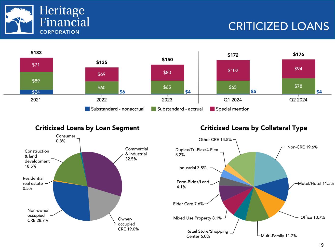 18 Net charge-offs (recoveries) on loans to average loans, annualized 0.01% (0.03)% (0.01)% 0.00% (0.11)% 0.06% 0.00% 0.00% 2021 2022 2023 Q2 2023 Q3 2023 Q4 2023 Q1 2024 Q2 2024 (0.15)% (0.10)% (0.05)% 0.00% 0.05% 0.10% Nonaccrual Loans $24 $6 $4 $5 $4 Nonaccrual loans Nonaccrual loans to loans receivable 2021 2022 2023 Q1 2024 Q2 2024 0.62% 0.15% 0.10% 0.11% 0.08% NONACCRUAL LOANS AND NET CHARGE-OFFS