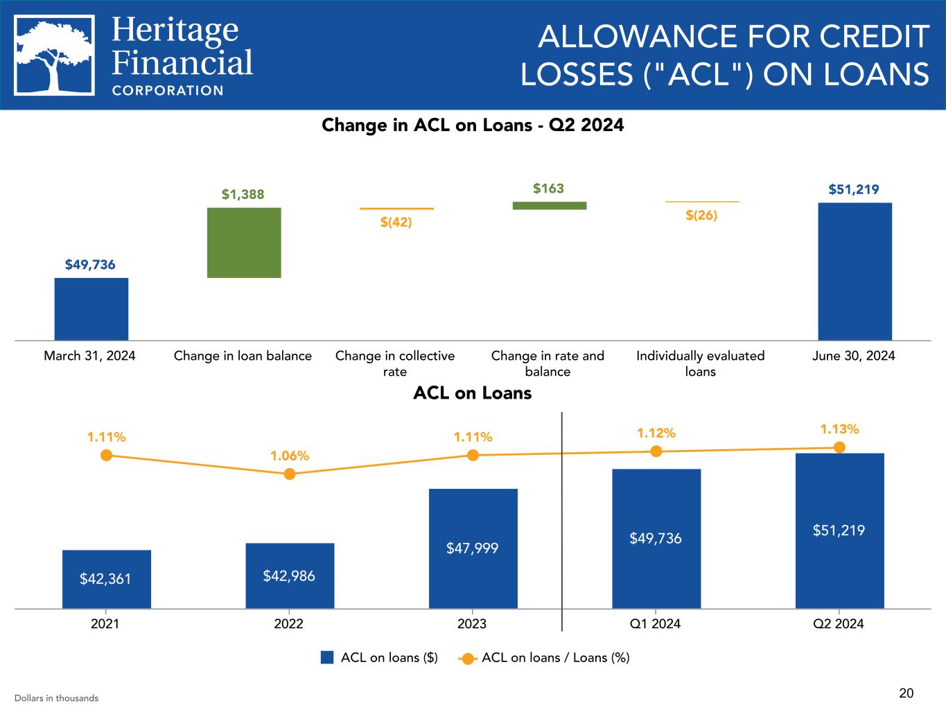 20 ACL on Loans $42,361 $42,986 $47,999 $49,736 $51,219 1.11% 1.06% 1.11% 1.12% 1.13% ACL on loans ($) ACL on loans / Loans (%) 2021 2022 2023 Q1 2024 Q2 2024 ALLOWANCE FOR CREDIT LOSSES ("ACL") ON LOANS $49,736 $1,388 $(42) $163 $(26) $51,219 March 31, 2024 Change in loan balance Change in collective rate Change in rate and balance Individually evaluated loans June 30, 2024 Change in ACL on Loans - Q2 2024 Dollars in thousands