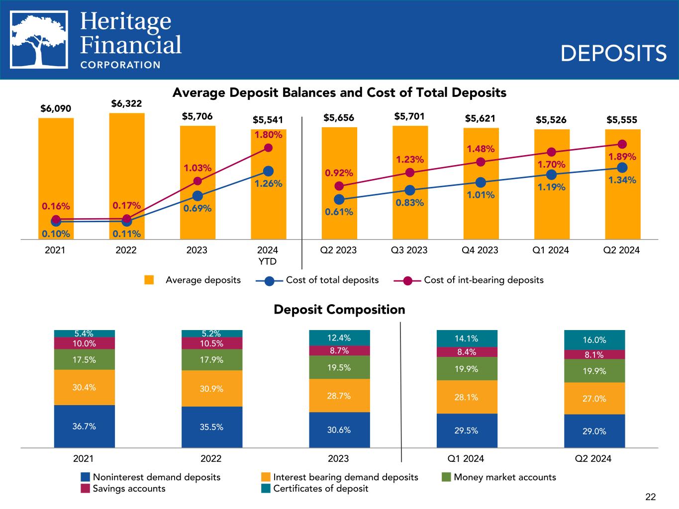 21 CRITICIZED LOANS AND NET CHARGE-OFF HISTORY Criticized Loans to Total Loans 3.63% 3.79% 6.50% 4.81% 3.34% 3.45% 3.89% 2.19% 2.05% 3.47% 2.63% 1.96% 2.32% 2.51% Heritage Peer Median 2018 2019 2020 2021 2022 2023 Q1 2024 Net Chargeoffs to Average Loans 0.06% 0.09% 0.07% 0.01% (0.03)% (0.01)% 0.00% 0.07% 0.11% 0.05% 0.03% 0.02% 0.07% 0.07% Heritage Peer Median 2018 2019 2020 2021 2022 2023 Q1 2024 (1) Criticized loans includes loans graded special mention or worse (2) Peer Median is the median of 17 identified peer banks ranging in asset size from $4 billion to $15 billion and is as of March 31, 2024 Proactive Credit Management • Heritage proactively downgrades loans that are experiencing financial difficulty. • Criticized loans(1) to total loans higher than peer median(2) since 2018 • NCOs recognized during the same period were lower than peer median.