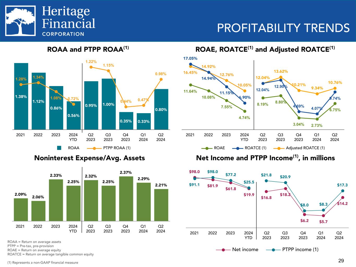 29 $98.0 $81.9 $61.8 $19.9 $91.1 $98.0 $77.2 $25.5 Net income PTPP income (1) 2021 2022 2023 2024 YTD Q2 2023 Q3 2023 Q4 2023 Q1 2024 Q2 2024 $16.8 $18.2 $6.2 $5.7 $14.2 $21.8 $20.9 $8.0 $8.3 $17.3 PROFITABILITY TRENDS ROAE, ROATCE(1) and Adjusted ROATCE(1) Noninterest Expense/Avg. Assets ROAA and PTPP ROAA(1) 1.38% 1.12% 0.86% 0.56% 0.95% 1.00% 0.35% 0.33% 0.80% 1.28% 1.34% 1.08% 0.72% 1.22% 1.15% 0.44% 0.47% 0.98% ROAA PTPP ROAA (1) 2021 2022 2023 2024 YTD Q2 2023 Q3 2023 Q4 2023 Q1 2024 Q2 2024 Net Income and PTPP Income(1), in millions 16.45% 14.92% 12.76% 10.05% 12.04% 13.62% 10.21% 9.34% 10.76% 17.05% 14.94% 11.15% 6.90% 12.04% 12.90% 4.69% 4.07% 9.74% 11.64% 10.08% 7.55% 4.74% 8.19% 8.80% 3.04% 2.73% 6.75% ROAE ROATCE (1) Adjusted ROATCE (1) 2021 2022 2023 2024 YTD Q2 2023 Q3 2023 Q4 2023 Q1 2024 Q2 2024 2.09% 2.06% 2.33% 2.25% 2.32% 2.25% 2.37% 2.29% 2.21% 2021 2022 2023 2024 YTD Q2 2023 Q3 2023 Q4 2023 Q1 2024 Q2 2024 ROAA = Return on average assets PTPP = Pre-tax, pre-provision ROAE = Return on average equity ROATCE = Return on average tangible common equity (1) Represents a non-GAAP financial measure