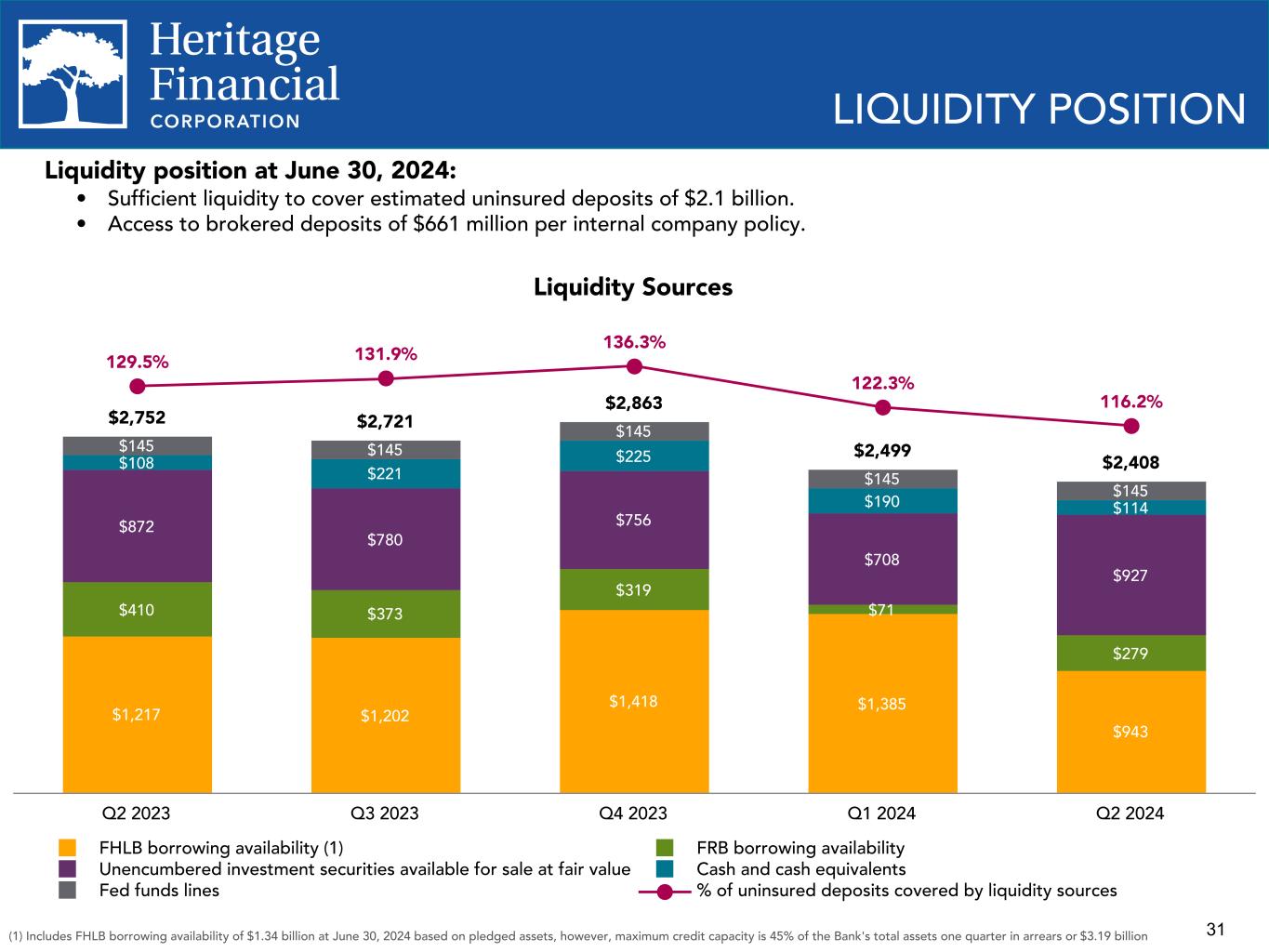30(1) Represents a non-GAAP financial measure (2) Current quarter ratios are estimates pending completion and filing of the Company's regulatory reports CAPITAL RATIOS Equity Ratios 11.5% 11.4% 11.9% 12.0% 12.0% 8.4% 8.2% 8.8% 8.8% 8.9% Stockholders' equity to total assets (GAAP) Tangible common equity to tangible assets(1) 2021 2022 2023 Q1 2024 Q2 2024 13.5% 12.8% 12.9% 12.6% 12.6% 8.7% 9.7% 10.0% 10.0% 10.1% 14.8% 14.0% 14.1% 13.9% 13.9% Total Risk Based Capital Tier 1 Leverage Ratio Common Equity Tier 1 2021 2022 2023 Q1 2024 Q2 2024 Regulatory Capital Ratios(2)