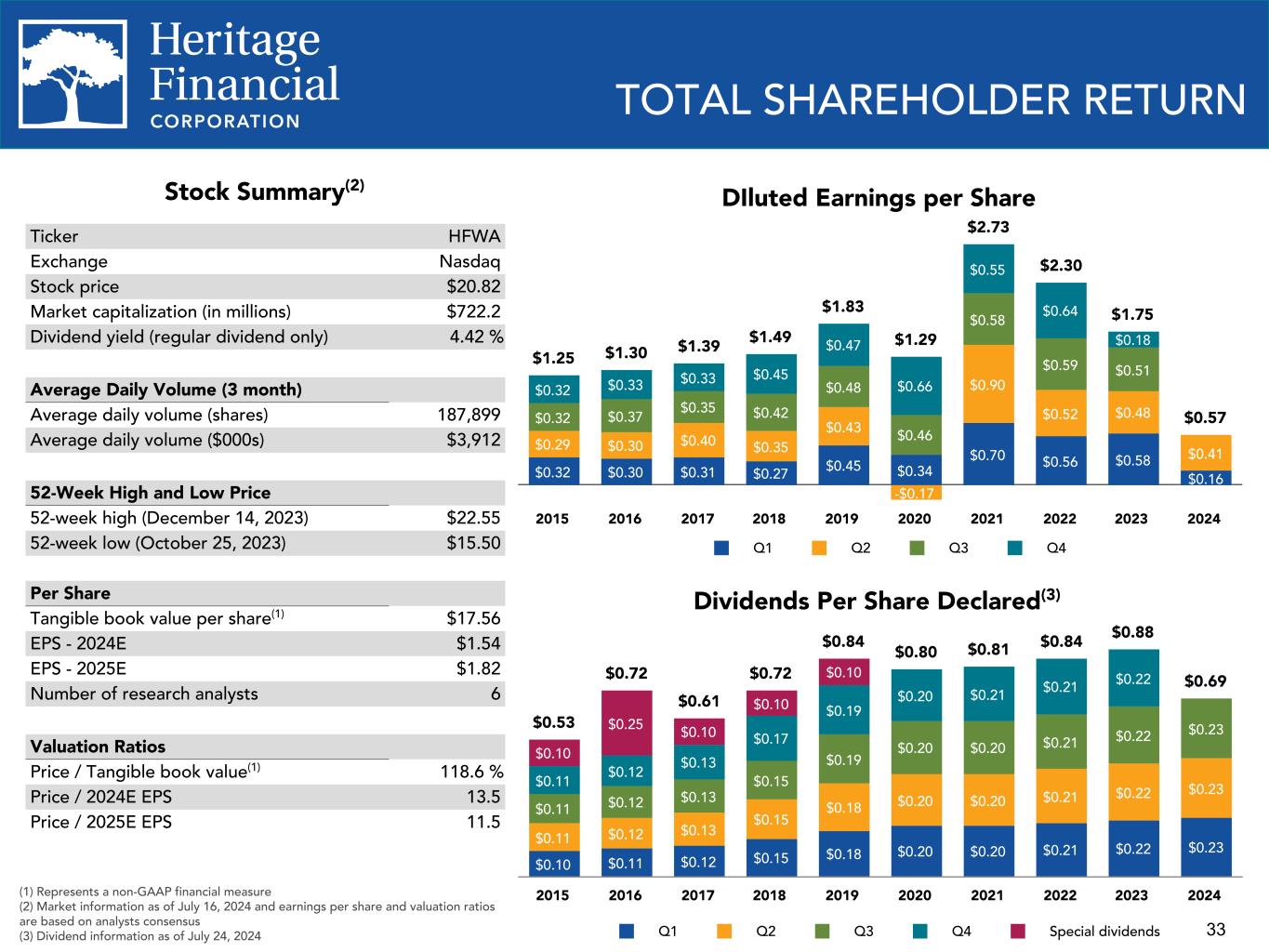 33 TOTAL SHAREHOLDER RETURN Stock Summary(2) Ticker HFWA Exchange Nasdaq Stock price $20.82 Market capitalization (in millions) $722.2 Dividend yield (regular dividend only) 4.42 % Average Daily Volume (3 month) Average daily volume (shares) 187,899 Average daily volume ($000s) $3,912 52-Week High and Low Price 52-week high (December 14, 2023) $22.55 52-week low (October 25, 2023) $15.50 Per Share Tangible book value per share(1) $17.56 EPS - 2024E $1.54 EPS - 2025E $1.82 Number of research analysts 6 Valuation Ratios Price / Tangible book value(1) 118.6 % Price / 2024E EPS 13.5 Price / 2025E EPS 11.5 Dividends Per Share Declared(3) $0.53 $0.72 $0.61 $0.72 $0.84 $0.80 $0.81 $0.84 $0.88 $0.69 $0.10 $0.11 $0.12 $0.15 $0.18 $0.20 $0.20 $0.21 $0.22 $0.23 $0.11 $0.12 $0.13 $0.15 $0.18 $0.20 $0.20 $0.21 $0.22 $0.23 $0.11 $0.12 $0.13 $0.15 $0.19 $0.20 $0.20 $0.21 $0.22 $0.23 $0.11 $0.12 $0.13 $0.17 $0.19 $0.20 $0.21 $0.21 $0.22 $0.10 $0.25 $0.10 $0.10 $0.10 Q1 Q2 Q3 Q4 Special dividends 2015 2016 2017 2018 2019 2020 2021 2022 2023 2024(1) Represents a non-GAAP financial measure (2) Market information as of July 16, 2024 and earnings per share and valuation ratios are based on analysts consensus (3) Dividend information as of July 24, 2024 DIluted Earnings per Share $1.25 $1.30 $1.39 $1.49 $1.83 $1.29 $2.73 $2.30 $1.75 $0.57 $0.32 $0.30 $0.31 $0.27 $0.45 $0.34 $0.70 $0.56 $0.58 $0.16 $0.29 $0.30 $0.40 $0.35 $0.43 -$0.17 $0.90 $0.52 $0.48 $0.41 $0.32 $0.37 $0.35 $0.42 $0.48 $0.46 $0.58 $0.59 $0.51 $0.32 $0.33 $0.33 $0.45 $0.47 $0.66 $0.55 $0.64 $0.18 Q1 Q2 Q3 Q4 2015 2016 2017 2018 2019 2020 2021 2022 2023 2024