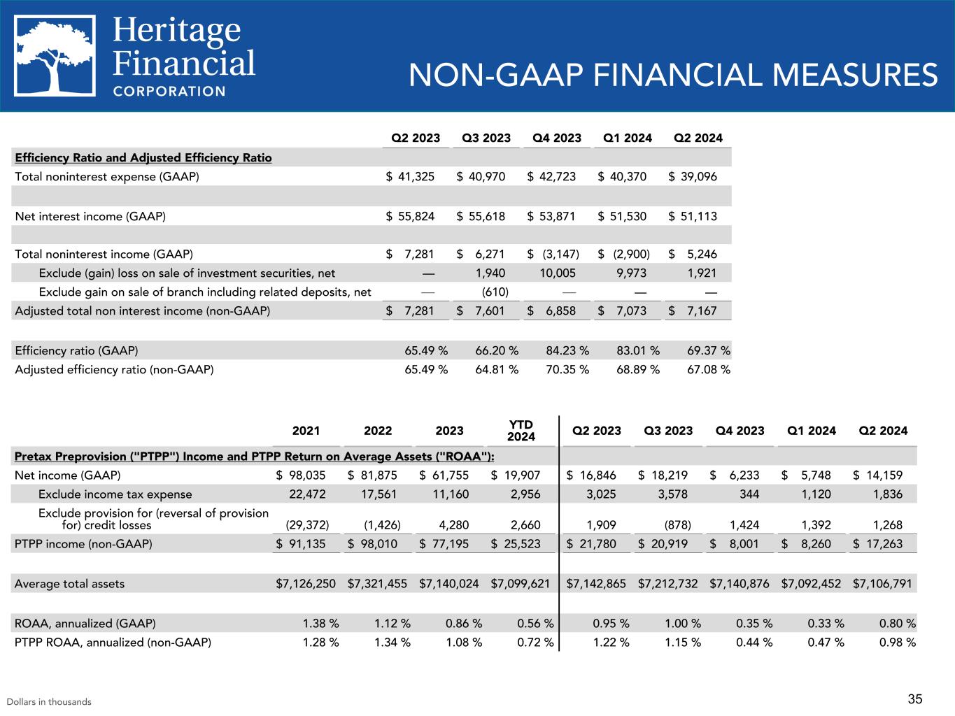 35 NON-GAAP FINANCIAL MEASURES Q2 2023 Q3 2023 Q4 2023 Q1 2024 Q2 2024 Efficiency Ratio and Adjusted Efficiency Ratio Total noninterest expense (GAAP) $ 41,325 $ 40,970 $ 42,723 $ 40,370 $ 39,096 Net interest income (GAAP) $ 55,824 $ 55,618 $ 53,871 $ 51,530 $ 51,113 Total noninterest income (GAAP) $ 7,281 $ 6,271 $ (3,147) $ (2,900) $ 5,246 Exclude (gain) loss on sale of investment securities, net — 1,940 10,005 9,973 1,921 Exclude gain on sale of branch including related deposits, net — (610) — — — Adjusted total non interest income (non-GAAP) $ 7,281 $ 7,601 $ 6,858 $ 7,073 $ 7,167 Efficiency ratio (GAAP) 65.49 % 66.20 % 84.23 % 83.01 % 69.37 % Adjusted efficiency ratio (non-GAAP) 65.49 % 64.81 % 70.35 % 68.89 % 67.08 % Dollars in thousands 2021 2022 2023 YTD 2024 Q2 2023 Q3 2023 Q4 2023 Q1 2024 Q2 2024 Pretax Preprovision ("PTPP") Income and PTPP Return on Average Assets ("ROAA"): Net income (GAAP) $ 98,035 $ 81,875 $ 61,755 $ 19,907 $ 16,846 $ 18,219 $ 6,233 $ 5,748 $ 14,159 Exclude income tax expense 22,472 17,561 11,160 2,956 3,025 3,578 344 1,120 1,836 Exclude provision for (reversal of provision for) credit losses (29,372) (1,426) 4,280 2,660 1,909 (878) 1,424 1,392 1,268 PTPP income (non-GAAP) $ 91,135 $ 98,010 $ 77,195 $ 25,523 $ 21,780 $ 20,919 $ 8,001 $ 8,260 $ 17,263 Average total assets $ 7,126,250 $ 7,321,455 $ 7,140,024 $ 7,099,621 $7,142,865 $7,212,732 $7,140,876 $7,092,452 $7,106,791 ROAA, annualized (GAAP) 1.38 % 1.12 % 0.86 % 0.56 % 0.95 % 1.00 % 0.35 % 0.33 % 0.80 % PTPP ROAA, annualized (non-GAAP) 1.28 % 1.34 % 1.08 % 0.72 % 1.22 % 1.15 % 0.44 % 0.47 % 0.98 %