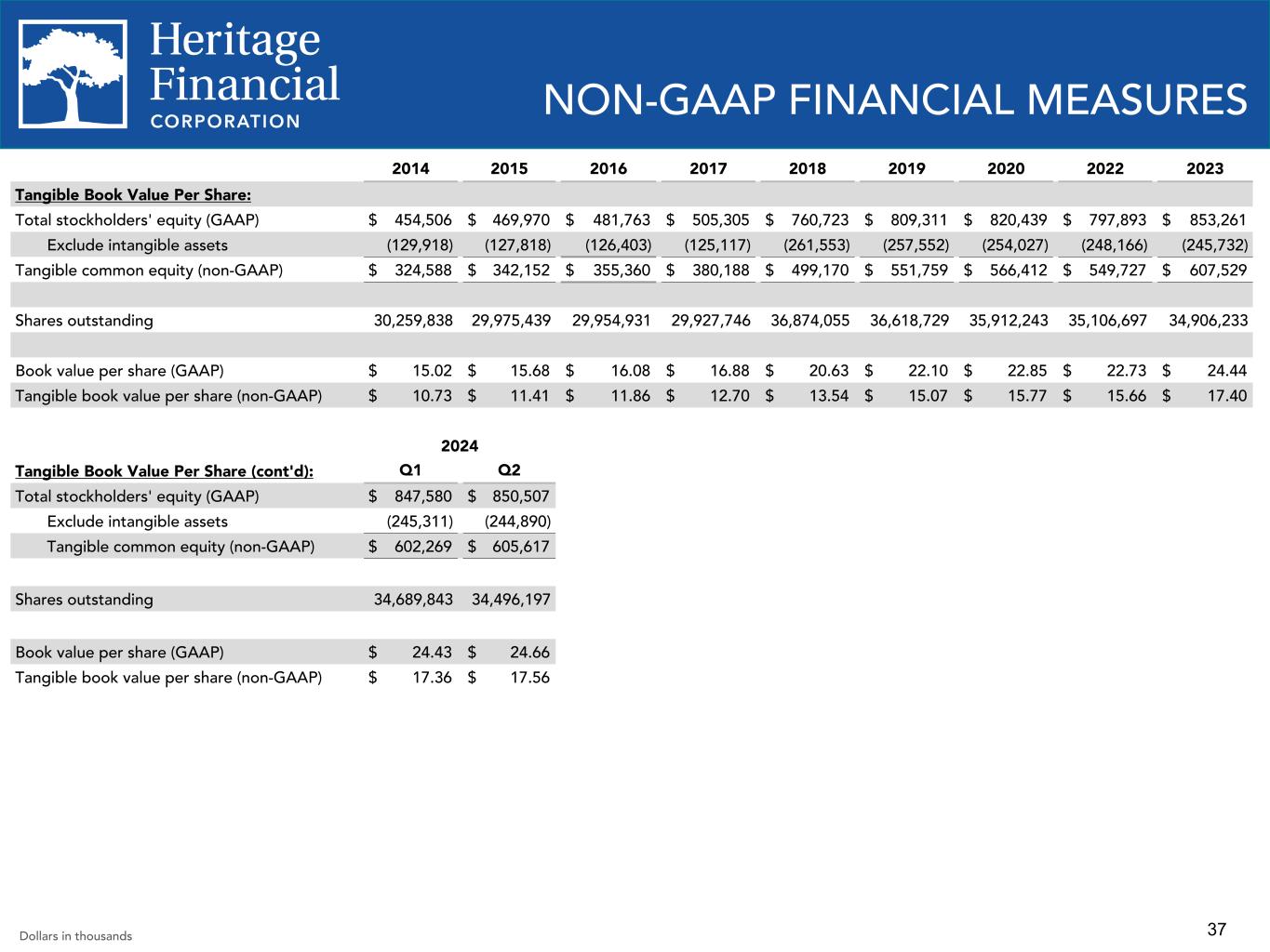 36 NON-GAAP FINANCIAL MEASURES 2021 2022 2023 YTD 2024 Q2 2023 Q3 2023 Q4 2023 Q1 2024 Q2 2024 Return on Average Tangible Common Equity ("ROATCE") and Adjusted ROATCE Net income (GAAP) $ 98,035 $ 81,875 $ 61,755 $ 19,907 $ 16,846 $ 18,219 $ 6,233 $ 5,748 $ 14,159 Add amortization of intangible assets 3,111 2,750 2,434 842 623 595 593 421 421 Exclude tax effect of adjustment (653) (578) (511) (177) (131) (125) (125) (88) (88) Tangible net income (non-GAAP) $ 100,493 $ 84,047 $ 63,678 $ 20,572 $ 17,338 $ 18,689 $ 6,701 $ 6,081 $ 14,492 Tangible net income (non-GAAP) $ 100,493 $ 84,047 $ 63,678 $ 20,572 $ 17,338 $ 18,689 $ 6,701 $ 6,081 $ 14,492 Exclude (gain) loss on sale of investment securities, net (29) 256 12,231 11,894 — 1,940 10,005 9,973 1,921 Exclude gain on sale of branch including related deposits, net — — (610) — — (610) — — — Exclude gain on sale of premise and equipment (4,440) (403) — — — — — — — Exclude tax effect of adjustment 938 31 (2,440) (2,498) — (279) (2,101) (2,094) (403) Adjusted tangible net income (non-GAAP) $ 96,962 $ 83,931 $ 72,859 $ 29,968 $ 17,338 $ 19,740 $ 14,605 $ 13,960 $ 16,010 Average stockholders' equity (GAAP) $ 842,067 $ 811,942 $ 818,042 $ 845,193 $ 824,742 $ 821,494 $ 813,383 $ 846,947 $ 843,438 Exclude average intangible assets (252,540) (249,566) (246,965) (245,321) (247,278) (246,663) (246,022) (245,536) (245,106) Average tangible common stockholders' equity (non-GAAP) $ 589,527 $ 562,376 $ 571,077 $ 599,872 $ 577,464 $ 574,831 $ 567,361 $ 601,411 $ 598,332 ROAE, annualized (GAAP) 11.64 % 10.08 % 7.55 % 4.74 % 8.19 % 8.80 % 3.04 % 2.73 % 6.75 % ROATCE, annualized (non-GAAP) 17.05 % 14.94 % 11.15 % 6.90 % 12.04 % 12.90 % 4.69 % 4.07 % 9.74 % Adjusted ROATCE, annualized (non- GAAP) 16.45 % 14.92 % 12.76 % 10.05 % 12.04 % 13.62 % 10.21 % 9.34 % 10.76 % Dollars in thousands
