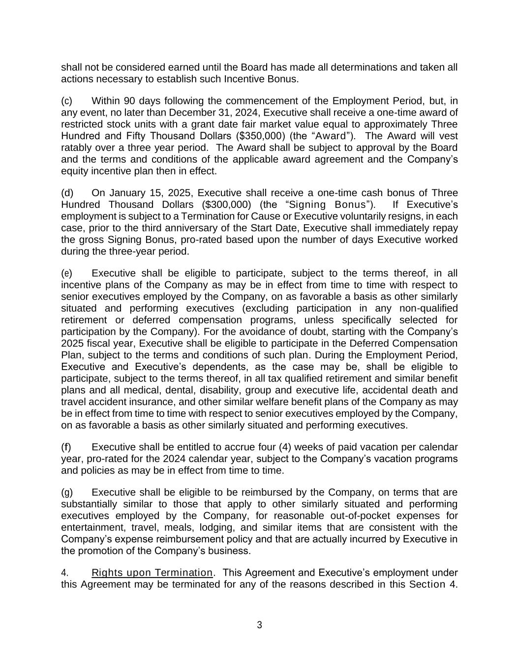 3 shall not be considered earned until the Board has made all determinations and taken all actions necessary to establish such Incentive Bonus. (c) Within 90 days following the commencement of the Employment Period, but, in any event, no later than December 31, 2024, Executive shall receive a one-time award of restricted stock units with a grant date fair market value equal to approximately Three Hundred and Fifty Thousand Dollars ($350,000) (the “Award”). The Award will vest ratably over a three year period. The Award shall be subject to approval by the Board and the terms and conditions of the applicable award agreement and the Company’s equity incentive plan then in effect. (d) On January 15, 2025, Executive shall receive a one-time cash bonus of Three Hundred Thousand Dollars ($300,000) (the “Signing Bonus”). If Executive’s employment is subject to a Termination for Cause or Executive voluntarily resigns, in each case, prior to the third anniversary of the Start Date, Executive shall immediately repay the gross Signing Bonus, pro-rated based upon the number of days Executive worked during the three-year period. (e) Executive shall be eligible to participate, subject to the terms thereof, in all incentive plans of the Company as may be in effect from time to time with respect to senior executives employed by the Company, on as favorable a basis as other similarly situated and performing executives (excluding participation in any non-qualified retirement or deferred compensation programs, unless specifically selected for participation by the Company). For the avoidance of doubt, starting with the Company’s 2025 fiscal year, Executive shall be eligible to participate in the Deferred Compensation Plan, subject to the terms and conditions of such plan. During the Employment Period, Executive and Executive’s dependents, as the case may be, shall be eligible to participate, subject to the terms thereof, in all tax qualified retirement and similar benefit plans and all medical, dental, disability, group and executive life, accidental death and travel accident insurance, and other similar welfare benefit plans of the Company as may be in effect from time to time with respect to senior executives employed by the Company, on as favorable a basis as other similarly situated and performing executives. (f) Executive shall be entitled to accrue four (4) weeks of paid vacation per calendar year, pro-rated for the 2024 calendar year, subject to the Company’s vacation programs and policies as may be in effect from time to time. (g) Executive shall be eligible to be reimbursed by the Company, on terms that are substantially similar to those that apply to other similarly situated and performing executives employed by the Company, for reasonable out-of-pocket expenses for entertainment, travel, meals, lodging, and similar items that are consistent with the Company’s expense reimbursement policy and that are actually incurred by Executive in the promotion of the Company’s business. 4. Rights upon Termination. This Agreement and Executive’s employment under this Agreement may be terminated for any of the reasons described in this Section 4.